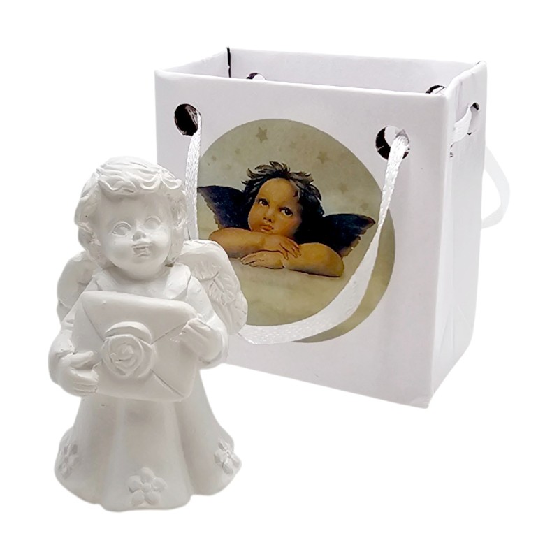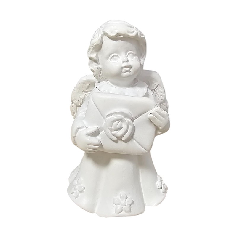 W rączkach trzyma kopertę, symbolizującą ważne przesłanie, list miłosny, lub dobre wieści, co dodaje figurce głębokiego i pełnego przesłania charakteru. Aniołek ubrany jest w uroczą, prostą sukienkę, a jego malutkie, delikatne skrzydełka są misternie wykonane. Urocza buzia z łagodnym wyrazem sprawia, że figurka emanuje spokojem.