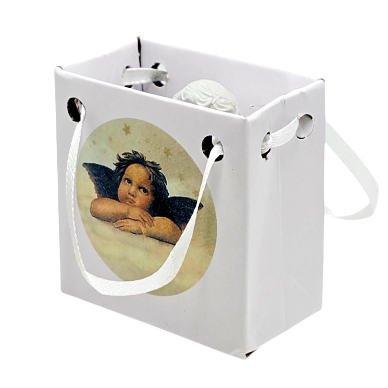 Każdy Aniołek jest starannie zapakowany w malutką, papierową torebkę prezentową o wymiarach 5x5x3 cm. To sprawia, że jest gotowy do wręczenia od razu, bez konieczności dodatkowego pakowania. To doskonały pomysł na symboliczny prezent.