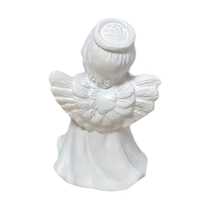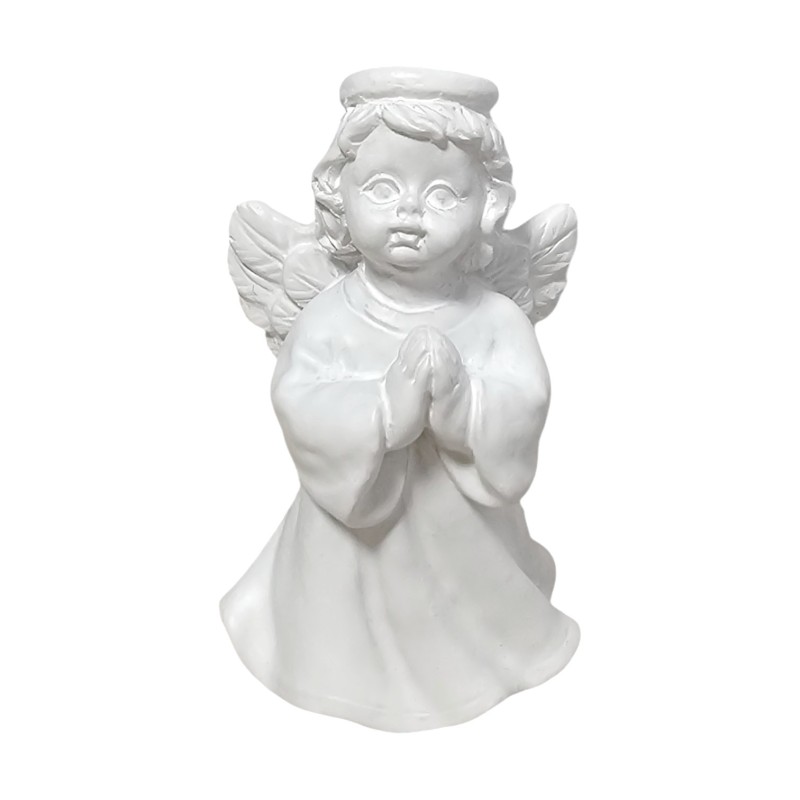 Aniołek ma około 5 cm wysokości i 3 cm szerokości, co czyni go uroczym, dyskretnym drobiazgiem, idealnym do postawienia na półce, biurku czy parapecie. Wykonany z trwałej żywicy syntetycznej, został starannie pomalowany na czysty, symboliczny biały kolor, który podkreśla jego niewinność i delikatność.