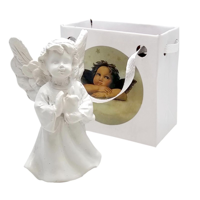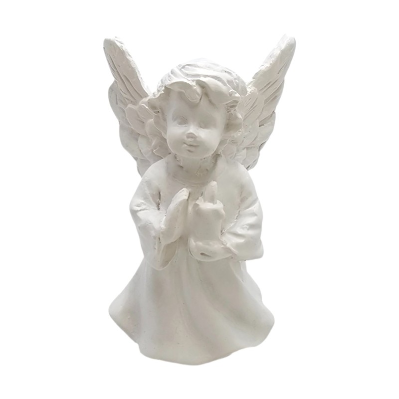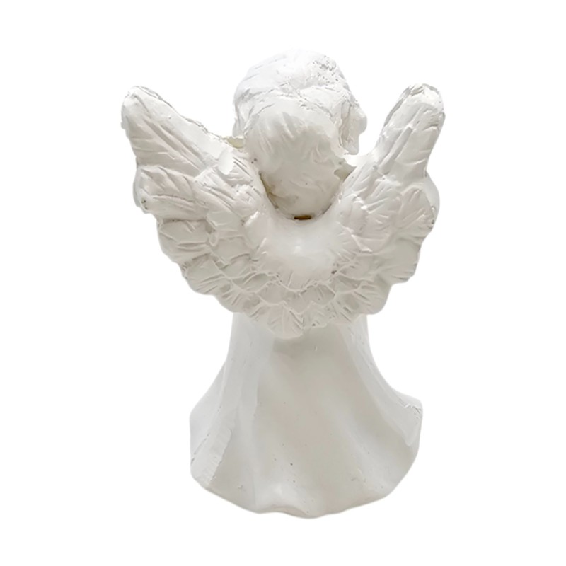 Aniołek ma około 5 cm wysokości i 3,5 cm szerokości, co czyni go uroczym, dyskretnym drobiazgiem, idealnym do postawienia na półce, biurku czy parapecie. Wykonany z trwałej żywicy syntetycznej, został starannie pomalowany na czysty, symboliczny biały kolor, który podkreśla jego niewinność i delikatność.