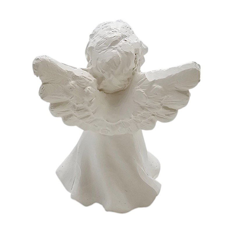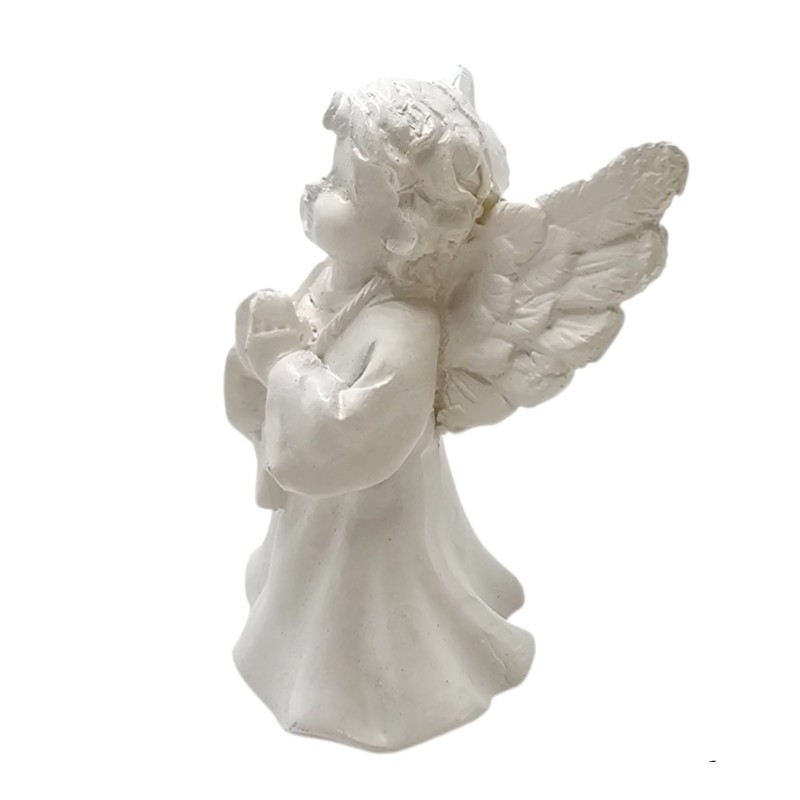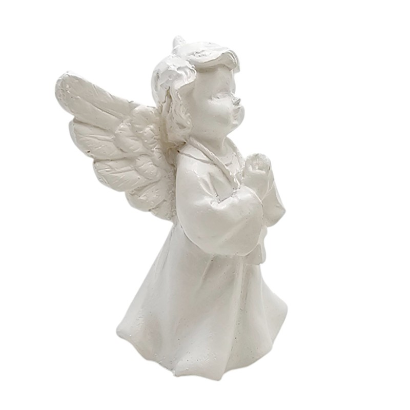 Aniołek ma około 5 cm wysokości i 3,5 cm szerokości, co czyni go uroczym, dyskretnym drobiazgiem, idealnym do postawienia na półce, biurku czy parapecie. Wykonany z trwałej żywicy syntetycznej, został starannie pomalowany na czysty, symboliczny biały kolor, który podkreśla jego niewinność i delikatność.