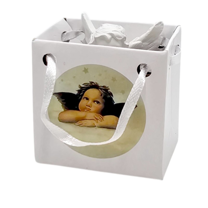 Każdy Aniołek jest starannie zapakowany w malutką, papierową torebkę prezentową o wymiarach 5x5x3 cm. To sprawia, że jest gotowy do wręczenia od razu, bez konieczności dodatkowego pakowania. To doskonały pomysł na symboliczny prezent.