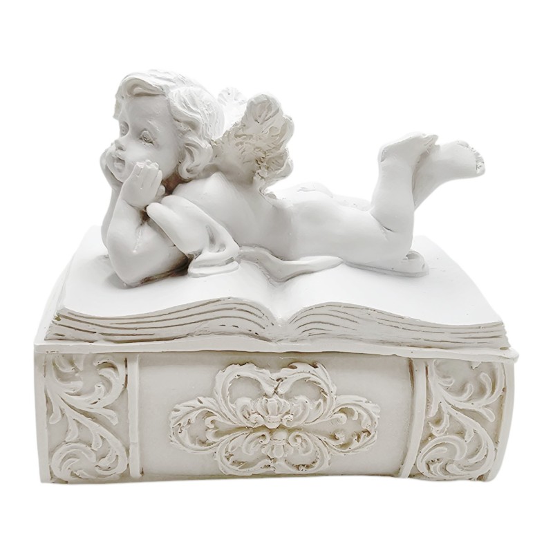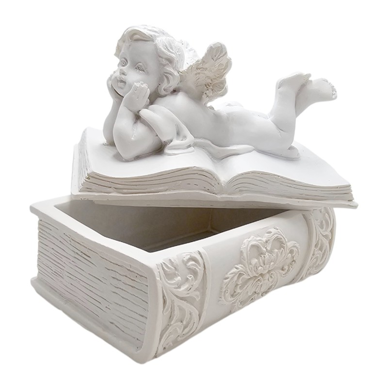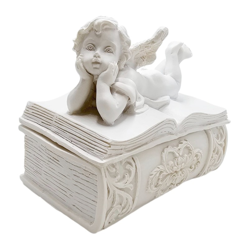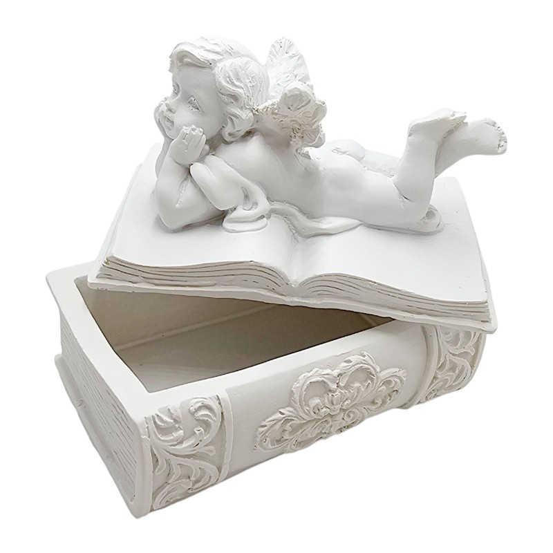 Szkatułka stylizowana jest na książkę. Wykonana z trwałej żywicy syntetycznej i pomalowana na elegancką biel, co nadaje jej subtelnego i uniwersalnego charakteru. Na jej wieczku dumnie spoczywa Aniołek o beztroskiej minie, który leży na brzuszku i podpiera się na rączkach, jakby z ciekawością przyglądał się światu. Ten pełen wdzięku widok natychmiast wywołuje uśmiech.
