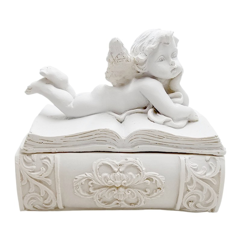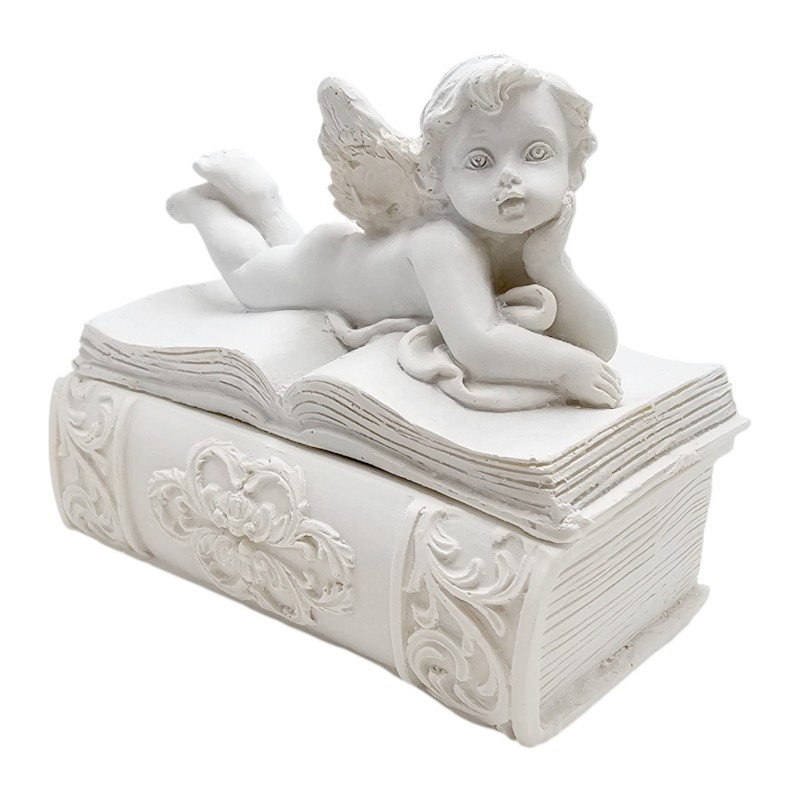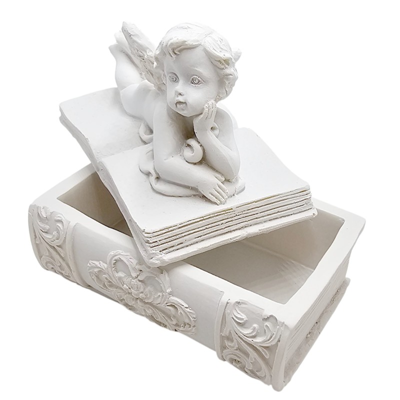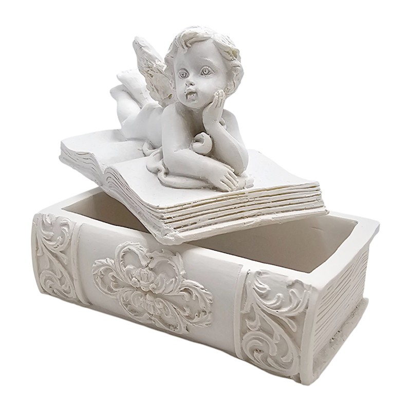 Szkatułka stylizowana jest na książkę. Została wykonana z trwałej żywicy syntetycznej i pomalowana na elegancką biel, co nadaje jej subtelnego i uniwersalnego charakteru. Na jej wieczku leży Aniołek, który podpiera się na jednej rączce, jakby z ciekawością przyglądał się światu. Ten pełen wdzięku widok natychmiast wywołuje uśmiech.
