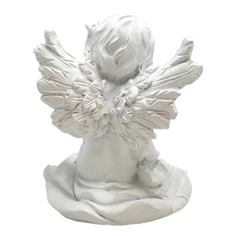 Aniołek ma około 8 cm wysokości i 6,5 cm szerokości, co czyni go idealnym, dyskretnym akcentem dekoracyjnym na półce, szafce nocnej czy komodzie. Wykonany z trwałej żywicy syntetycznej, został starannie pomalowany z dbałością o każdy detal.
