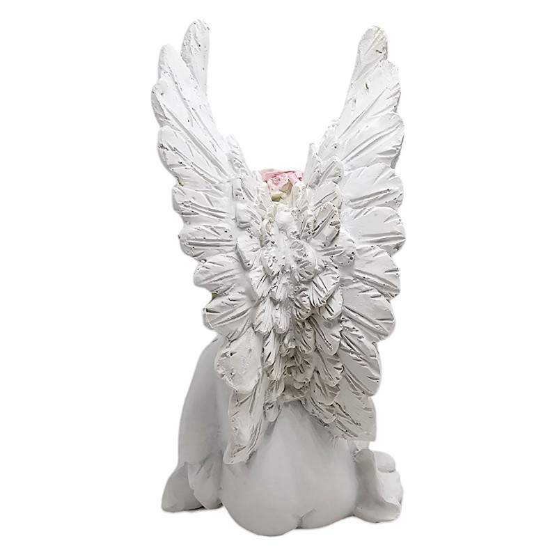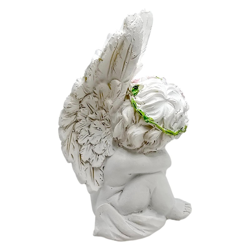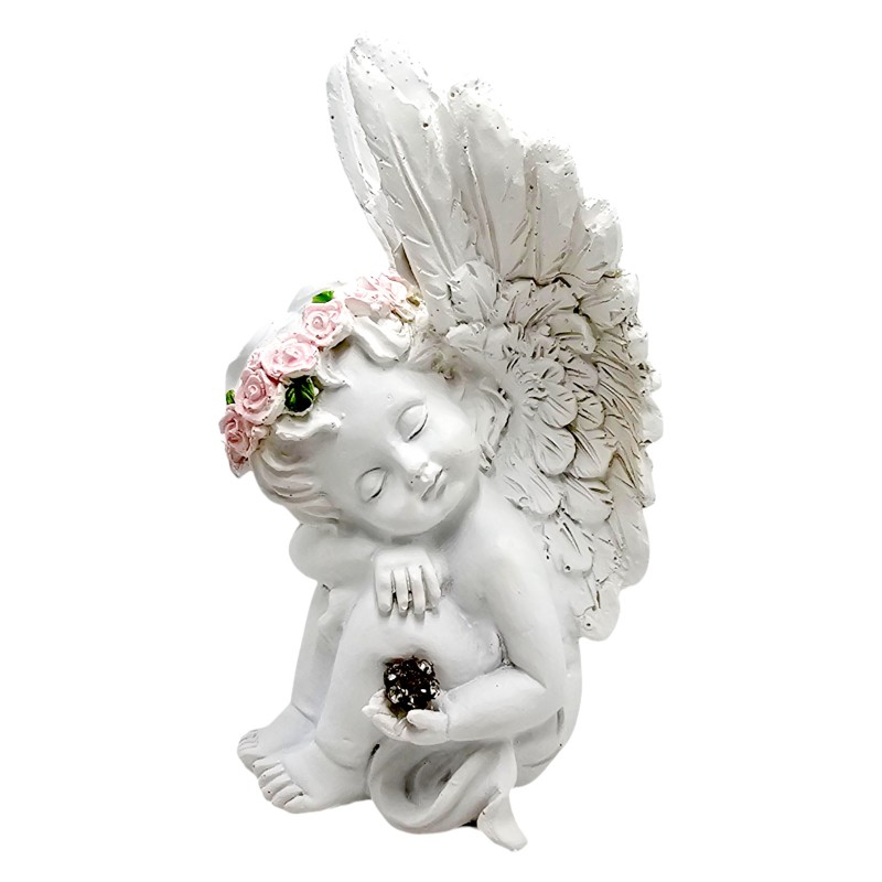 Aniołek siedzi z zamkniętymi oczami, wydaje się spać, co tworzy niezwykle kojący i czuły wizerunek. Na jego głowie spoczywa uroczy wianuszek z różowych róż, a w rączce trzyma świecącą ozdobę, która dodaje figurce magicznego blasku. Wszystkie detale są misternie dopracowane, co świadczy o dbałości o jakość.