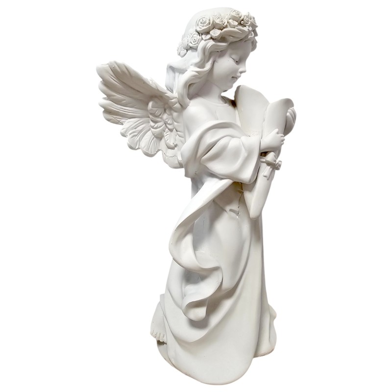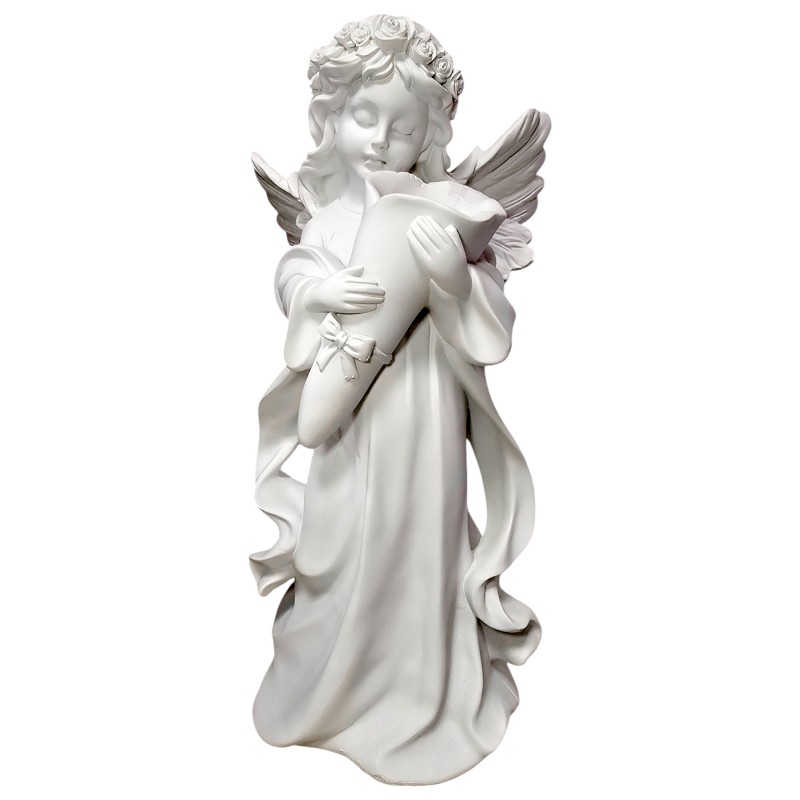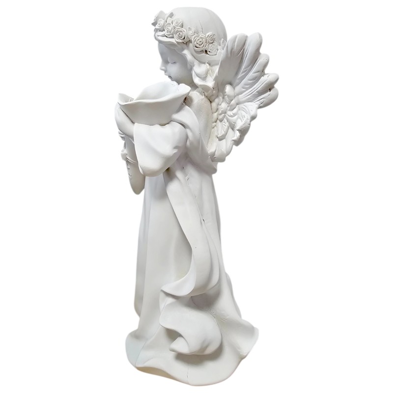 Anioł jest cały biały, co podkreśla jego czystość, niewinność i delikatność. Na głowie ma elegancki wianek z róż, dodający mu uroku i naturalnego piękna. Jego długie, zwiewne szaty oraz śliczne skrzydła zostały oddane z niezwykłą precyzją, co świadczy o mistrzowskim wykonaniu. W rączkach czule trzyma róg obfitości, symbolizujący dobrobyt, szczęście i dostatek, co czyni go wyjątkowym talizmanem. Każdy detal figurki został starannie dopracowany, tworząc wspaniałą i spójną kompozycję.