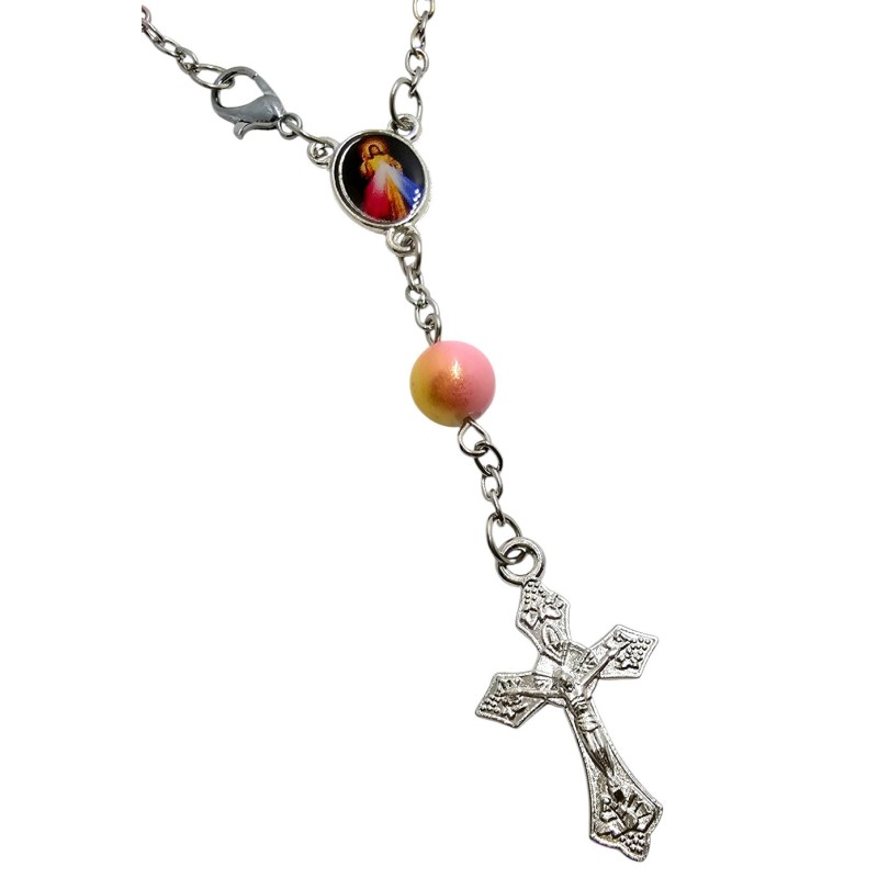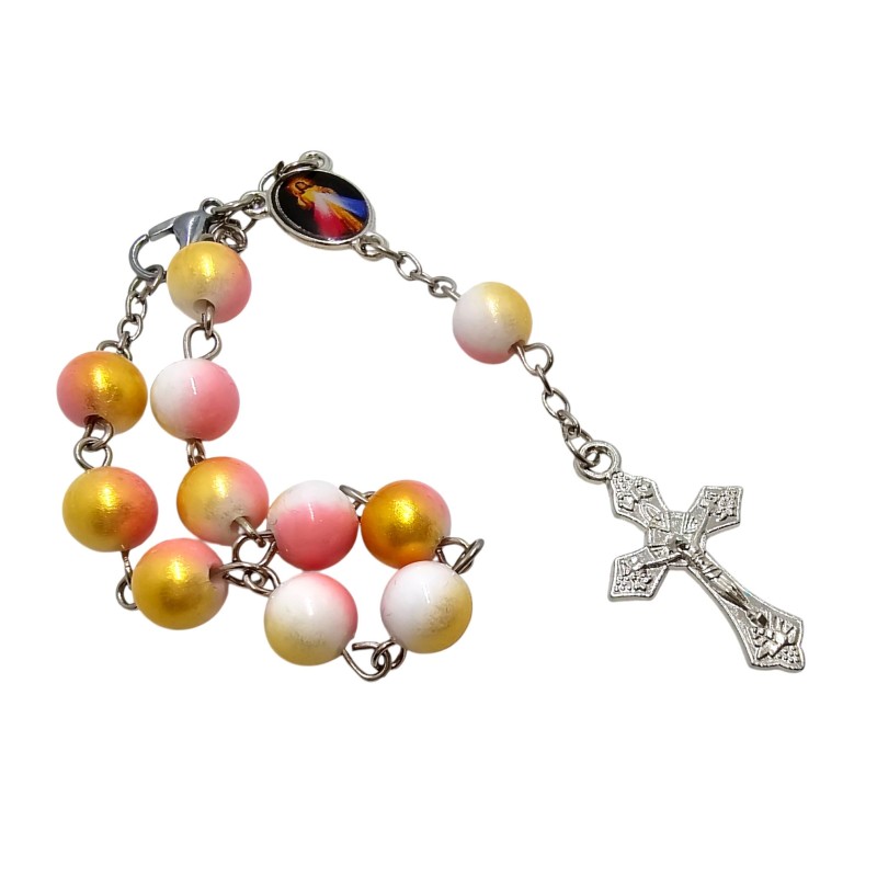 Elegancka i głęboko symboliczna zapinana dziesiątka różańca, idealna do noszenia na co dzień lub do modlitwy w podróży. Różaniec wykonany jest na trwałym łańcuszku, co gwarantuje jego wytrzymałość. Charakteryzuje się wyjątkowymi, złoto-różowymi koralikami (o perłowym lub żywicznym połysku), które nadają mu szlachetnego wyglądu. To doskonały wybór dla osób czczących kult Jezusa Miłosiernego.