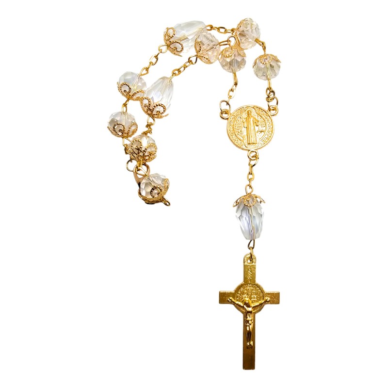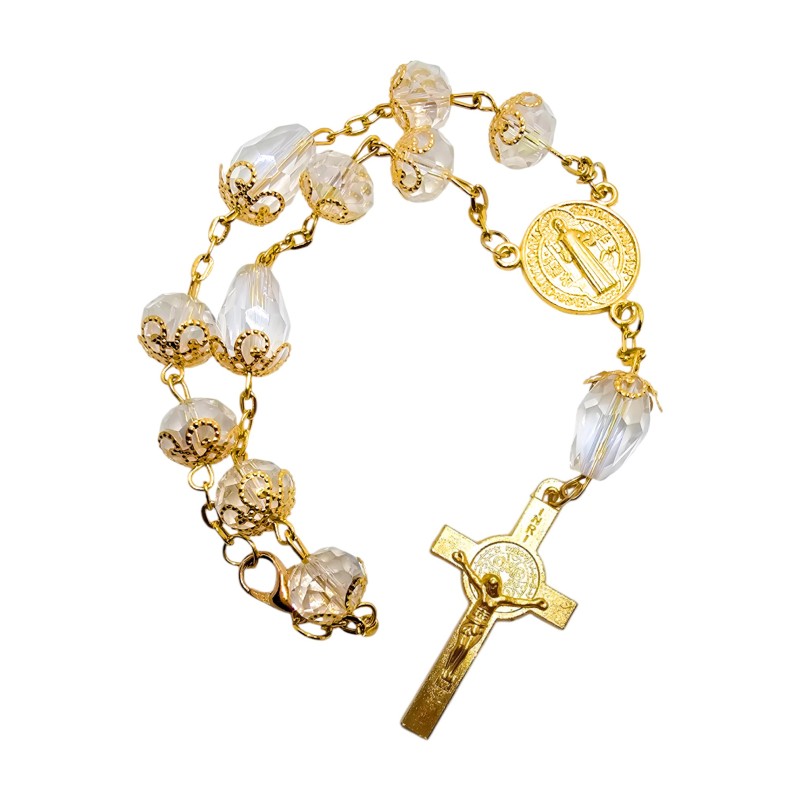 Różaniec wykonany jest na solidnym, metalowym łańcuszku w kolorze złota. Jego ozdobą są transparentne, kryształowe koraliki o zróżnicowanych kształtach. Najmniejsze koraliki o okrągłym kształcie mają średnicę 1 cm, a całość dopełniają trzy koraliki w kształcie łezki, które wnoszą do kompozycji lekkość i elegancję. Dodatkowym atutem są ażurowe zdobienia, które nadają im wyjątkowego charakteru.