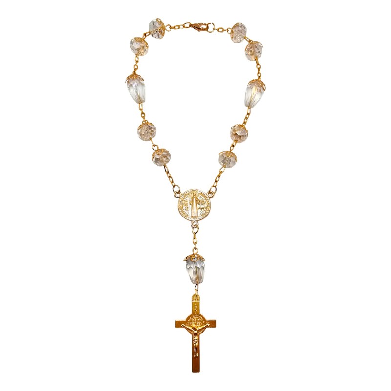 Centralnym punktem różańca jest medalik Świętego Benedykta, a całość wieńczy prosty krzyż o wymiarach 21x38 mm. Połączenie tych dwóch symboli sprawia, że różaniec staje się potężnym narzędziem w walce ze złem i doskonałym upominkiem.
