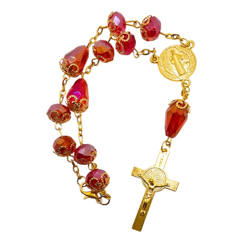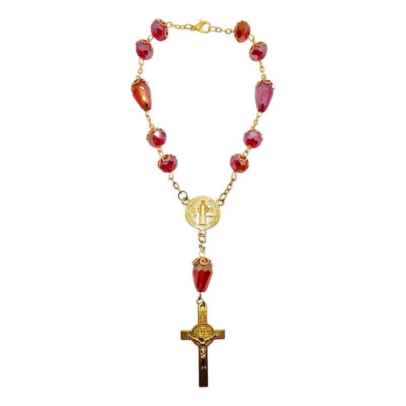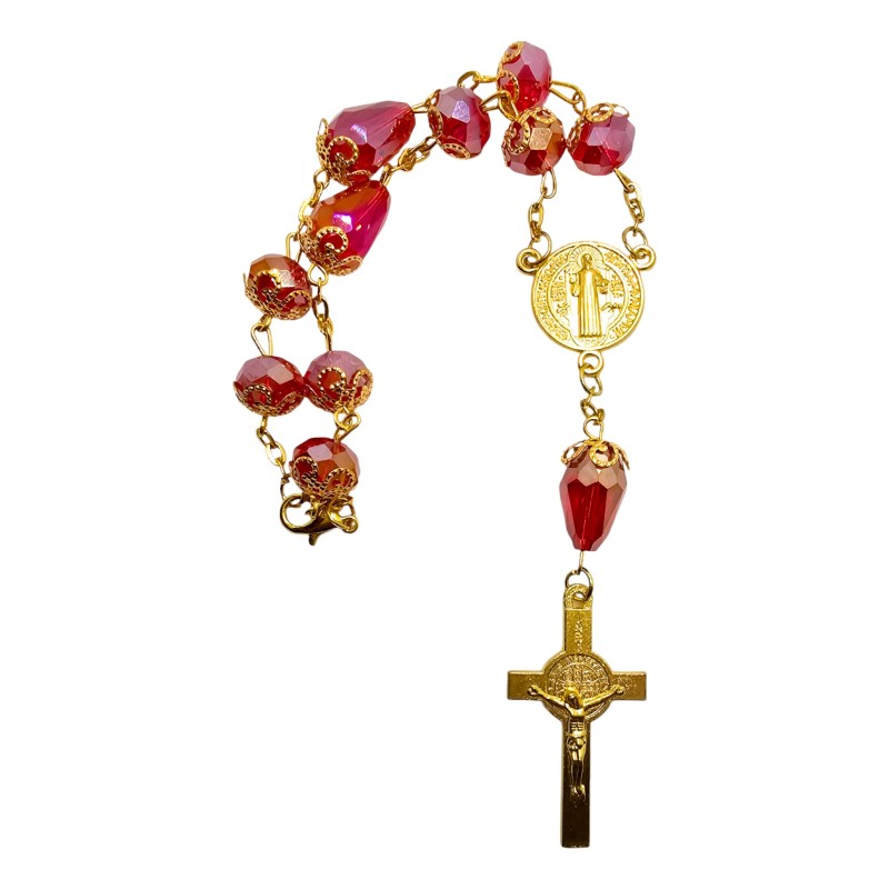 Centralnym punktem różańca jest medalik Świętego Benedykta, a całość wieńczy prosty krzyż o wymiarach 21x38 mm. Połączenie tych dwóch symboli sprawia, że różaniec staje się potężnym narzędziem w walce ze złem i doskonałym upominkiem.