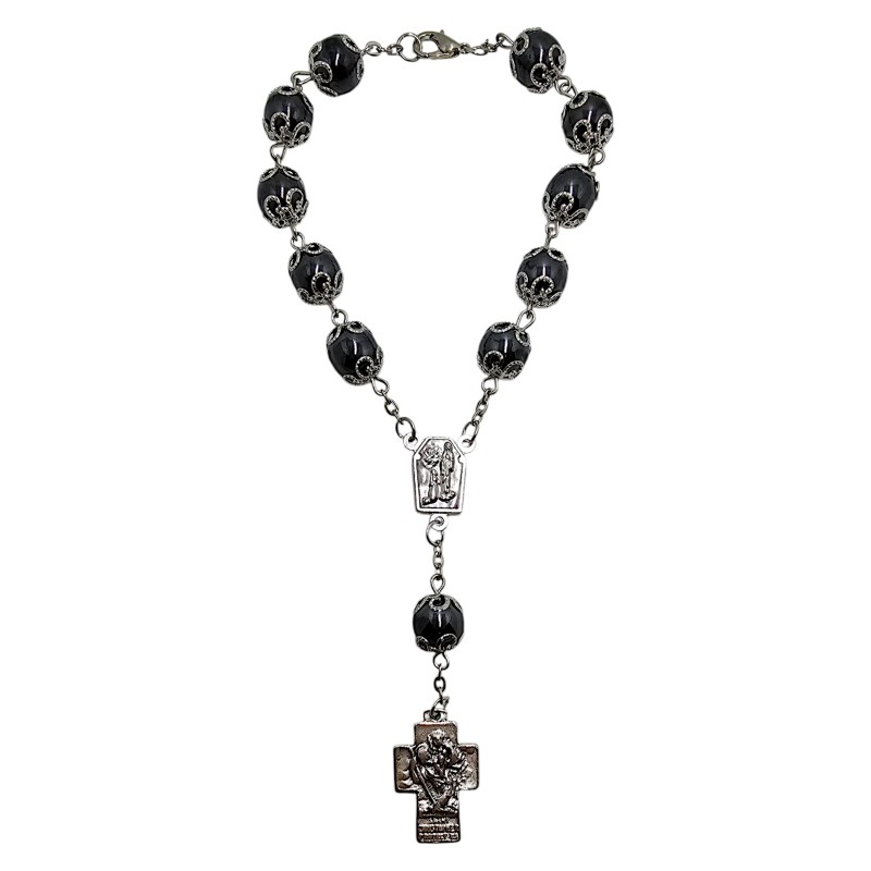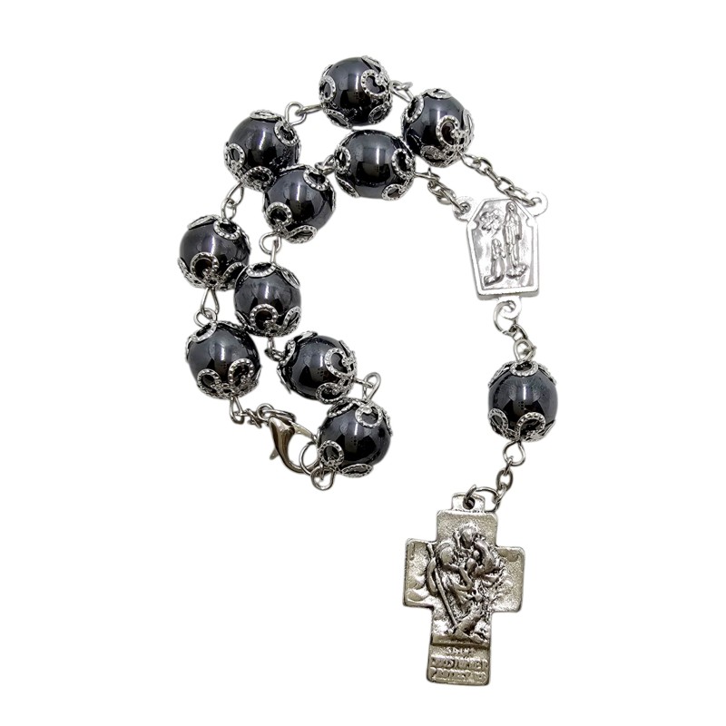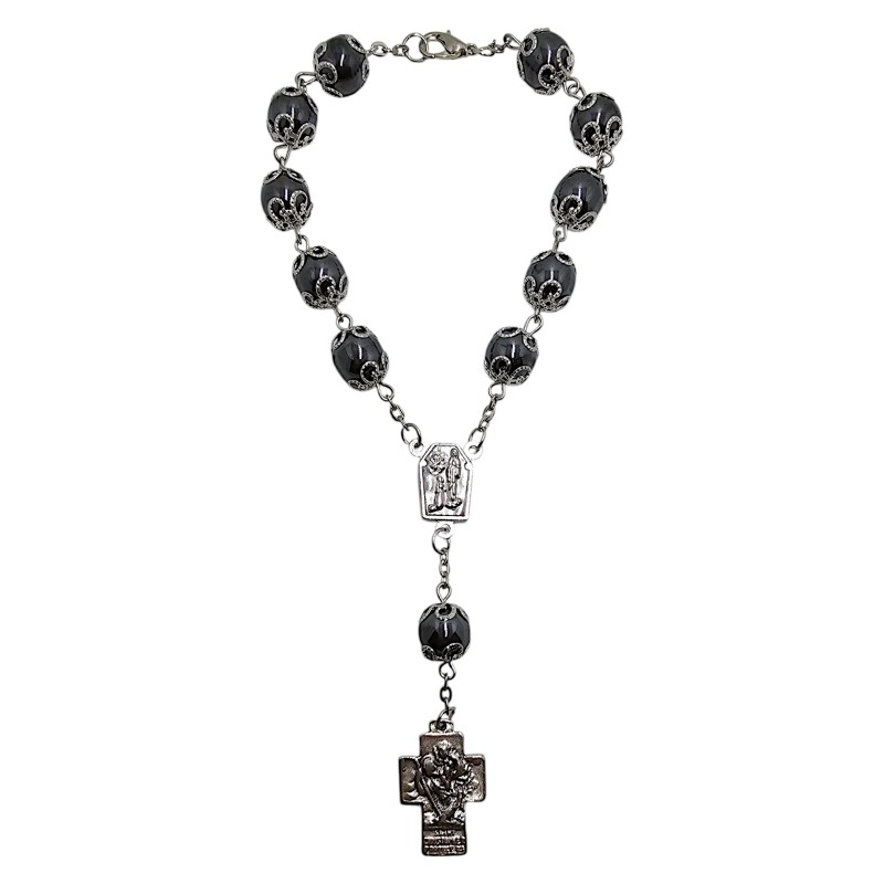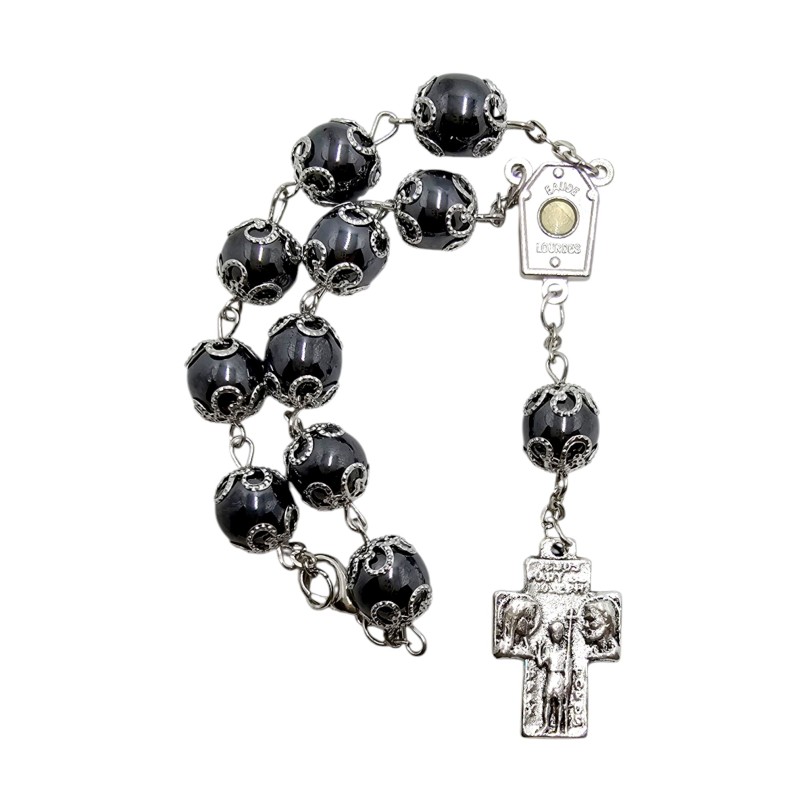 Różaniec został wykonany z ciemnych, błyszczących koralików z hematytu o wielkości 1 cm, które symbolizują siłę i stabilność. Każdy koralik jest dodatkowo ozdobiony misternym, metalowym ażurem, co nadaje całości niezwykłej elegancji i subtelności.