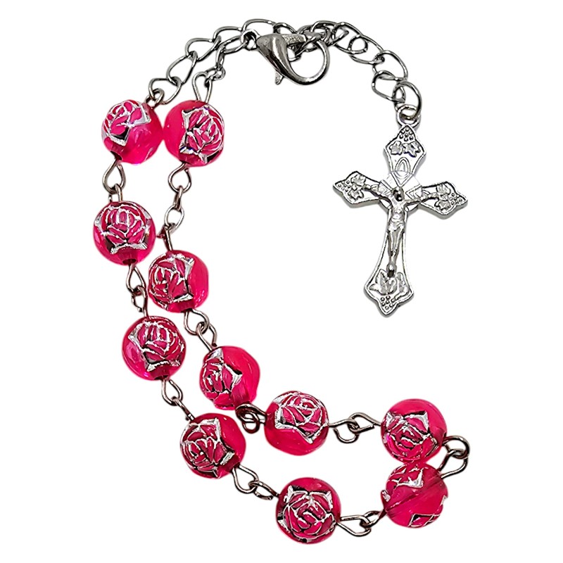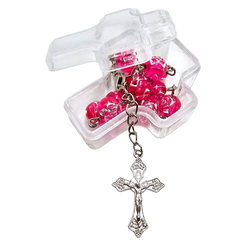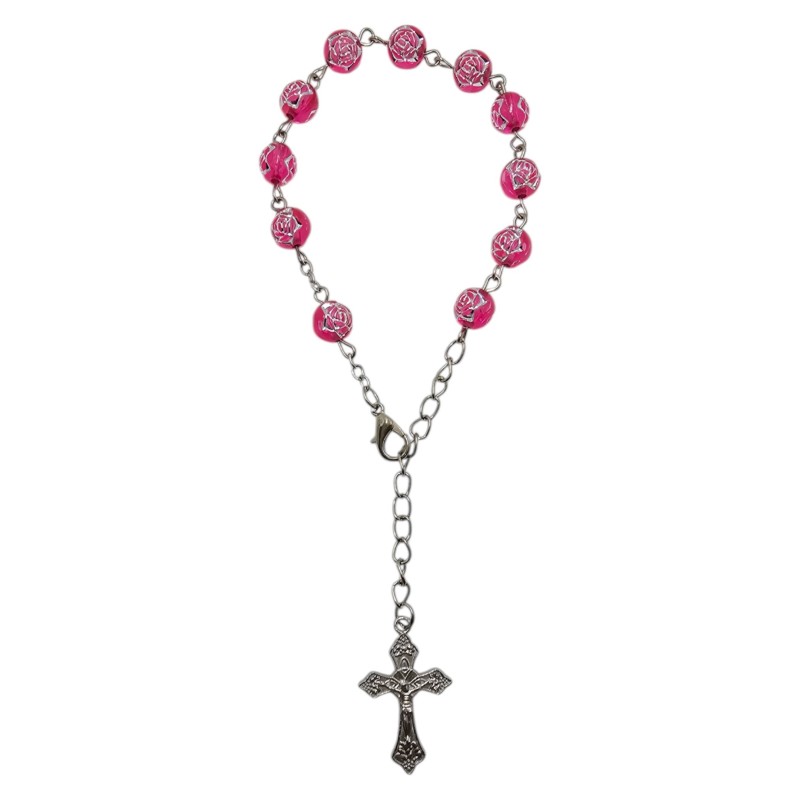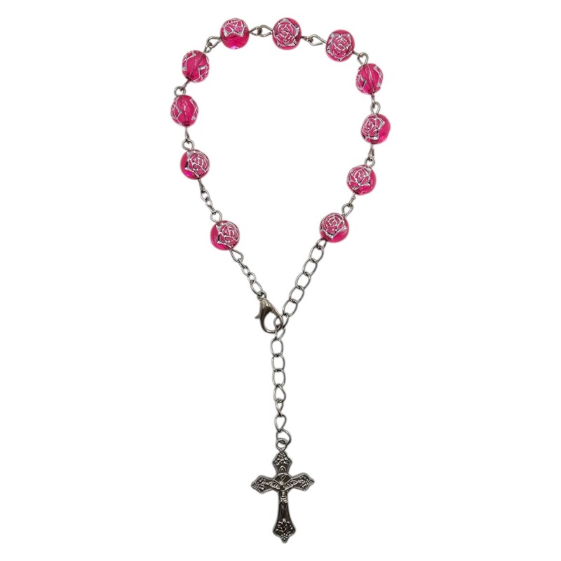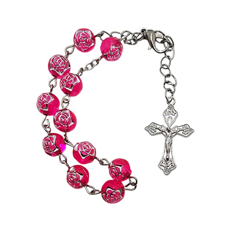 Różaniec składa się z jedenastu transparentnych, różowych koralików o średnicy 8 mm. Są one wykonane z trwałego plastiku. Dziesięć koralików przeznaczonych jest do odmawiania "Zdrowaś Maryjo", a jeden do "Ojcze Nasz". Całość wieńczy ozdobny krzyż o wielkości 18x29 mm. To, co czyni ten różaniec wyjątkowo pięknym, to misternie wytłoczone i wypełnione srebrnym kolorem róże na każdym koraliku. Te detale dodają całości ogromnego uroku i subtelności.