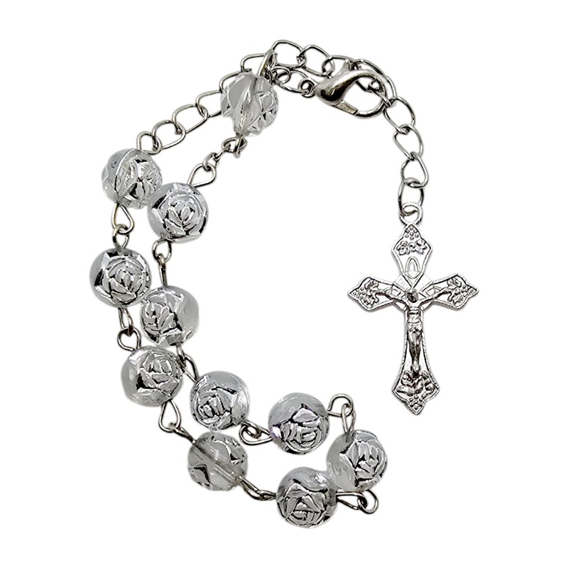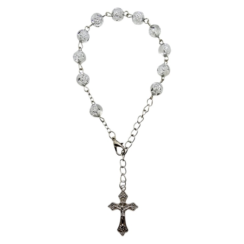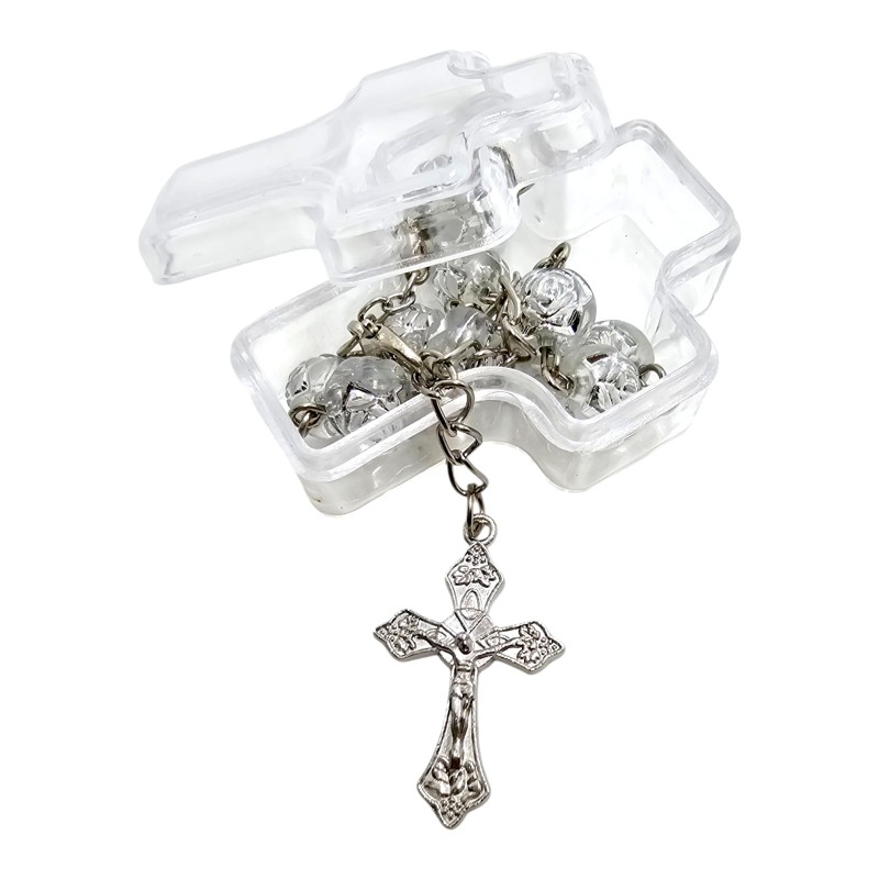 Różaniec składa się z jedenastu przeźroczystych koralików o średnicy 8 mm. Są one wykonane z trwałego plastiku. Dziesięć koralików przeznaczonych jest do odmawiania "Zdrowaś Maryjo", a jeden do "Ojcze Nasz". Całość wieńczy ozdobny krzyż o wielkości 18x29 mm. To, co czyni ten różaniec wyjątkowo pięknym, to misternie wytłoczone i wypełnione srebrnym kolorem róże na każdym koraliku. Te detale dodają całości ogromnego uroku i subtelności.