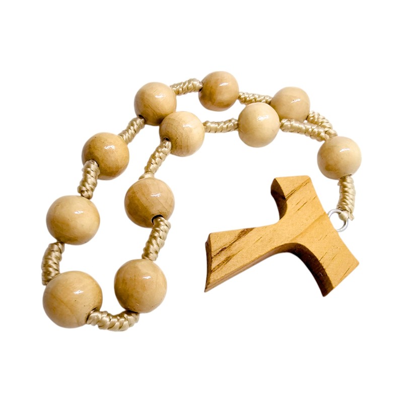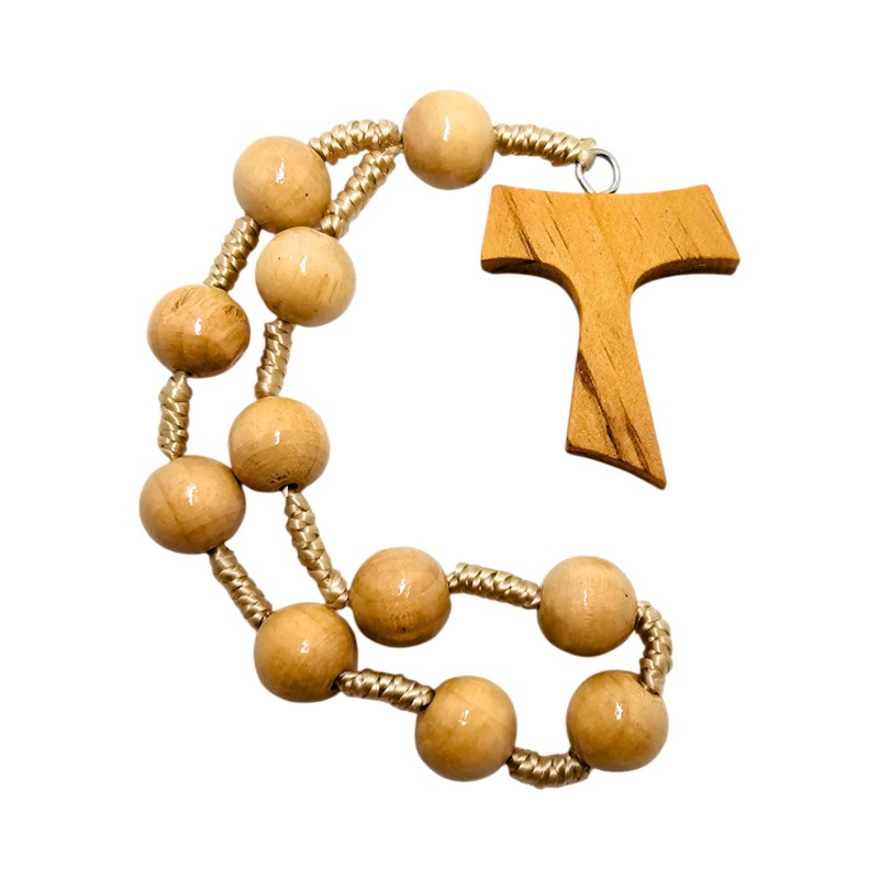 Zwieńczeniem tej wyjątkowej dziesiątki jest krzyż Tauka, symbol Franciszkański, reprezentujący pokorę i oddanie. To prosta, a zarazem potężna forma krzyża, która doskonale komponuje się z naturalnym drewnem. Dzięki wykonaniu na sznurku, dziesiątka jest lekka, elastyczna i trwała, idealna do noszenia przy sobie lub jako element osobistego kącika modlitewnego.