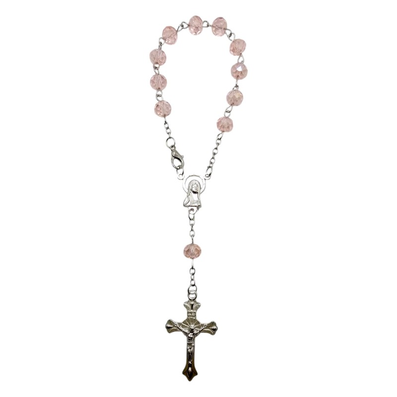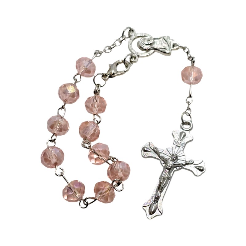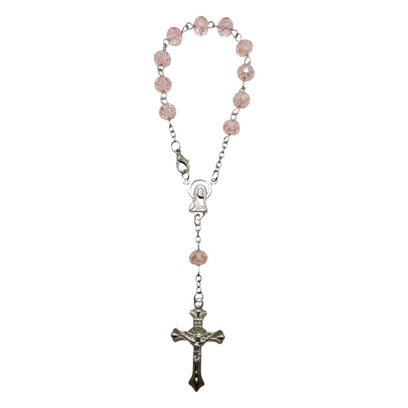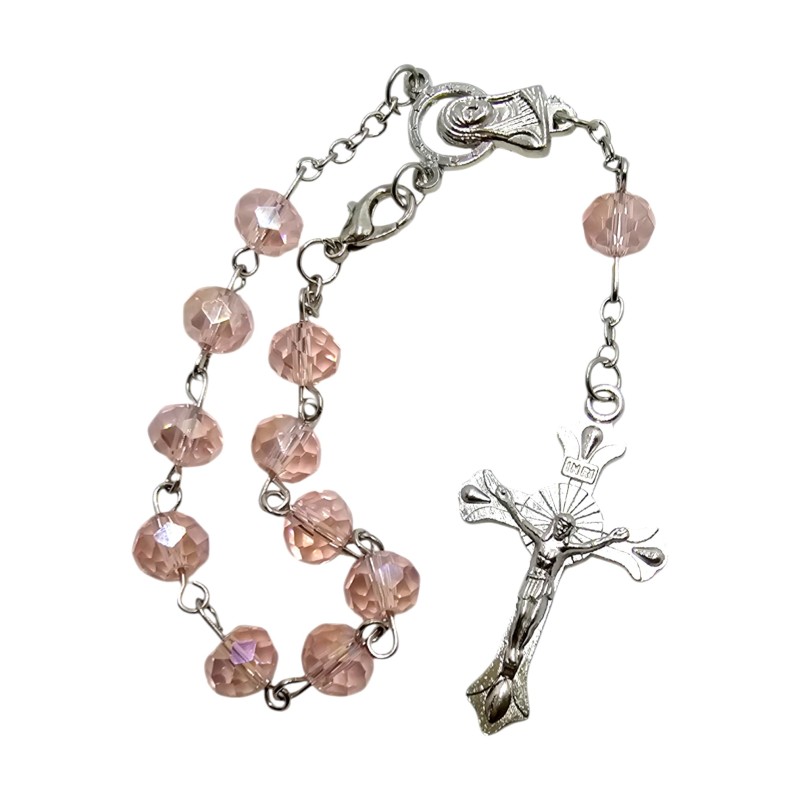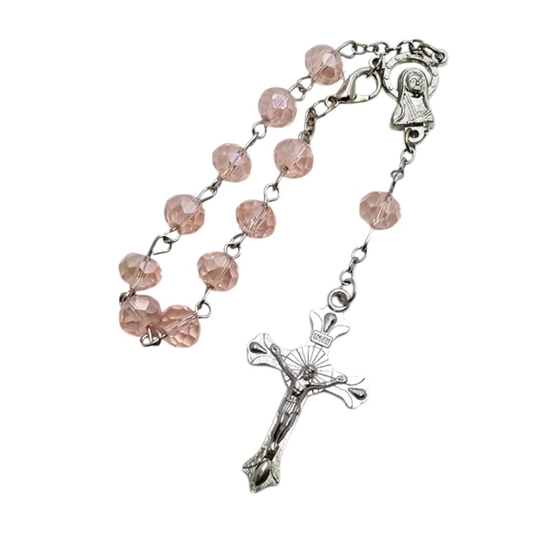 Dziesiątka wykonana jest z pięknie szlifowanych kryształowych koralików o wielkości 8 mm, które delikatnie połyskują, nadając jej wyrafinowanego wyglądu. Pastelowy róż symbolizuje miłość, czułość i radość, co czyni modlitwę jeszcze bardziej refleksyjną.