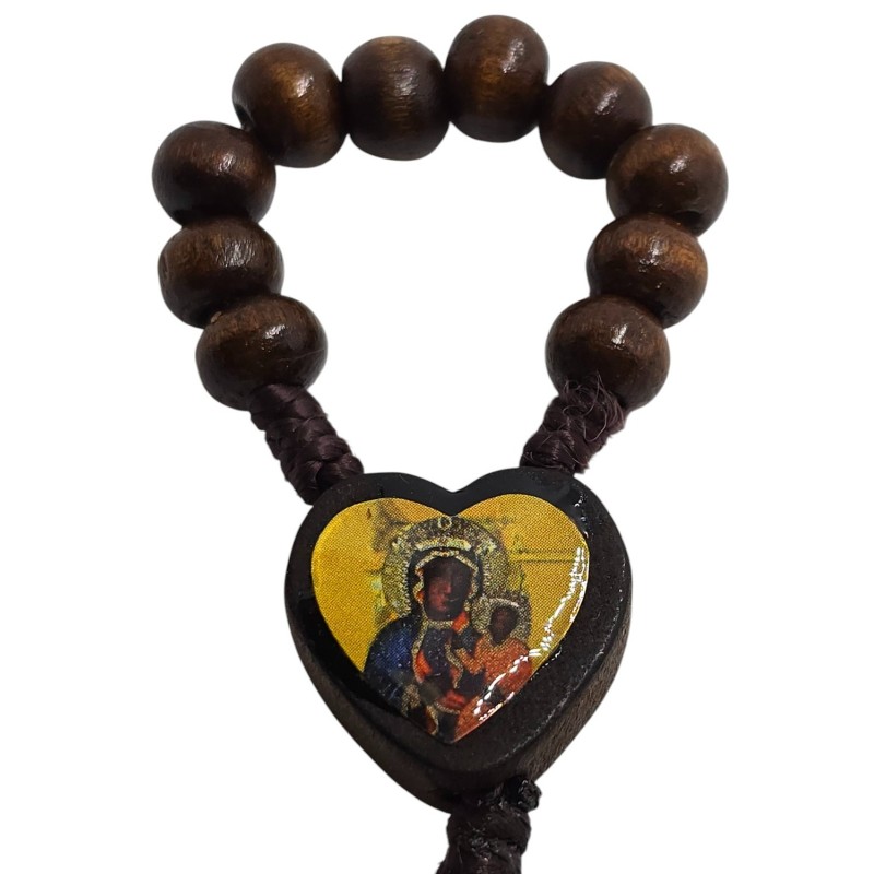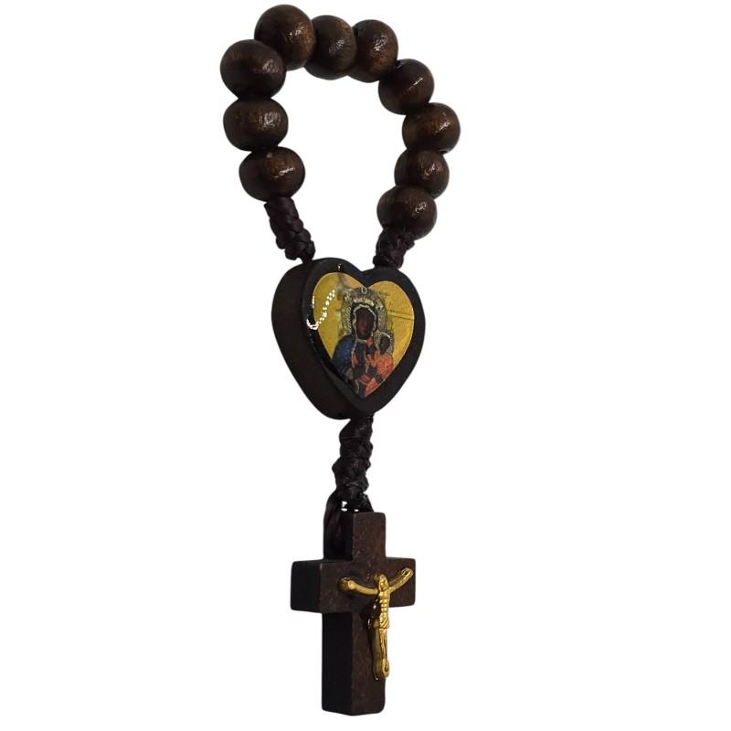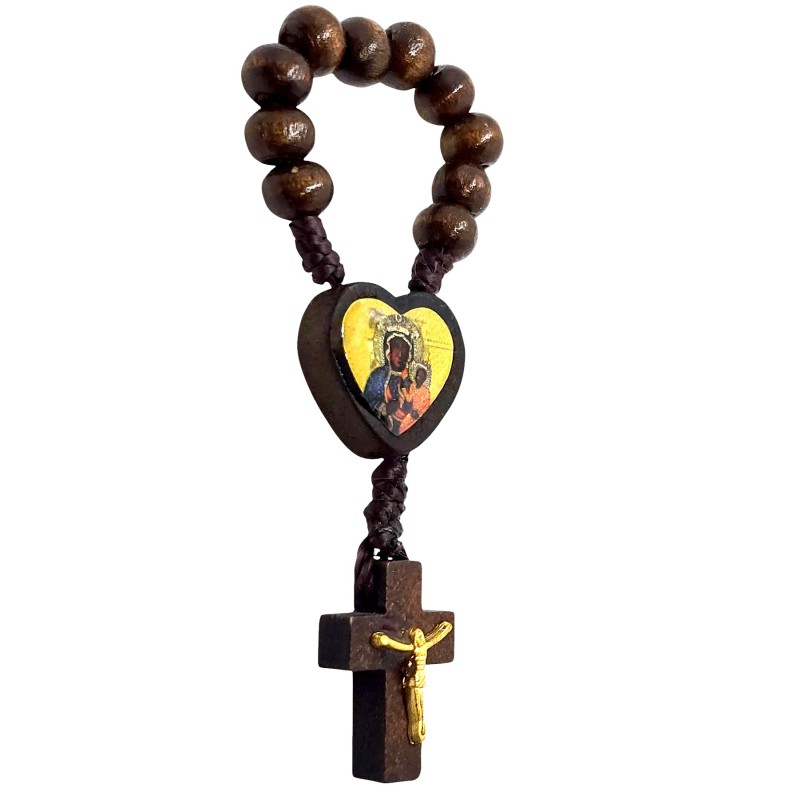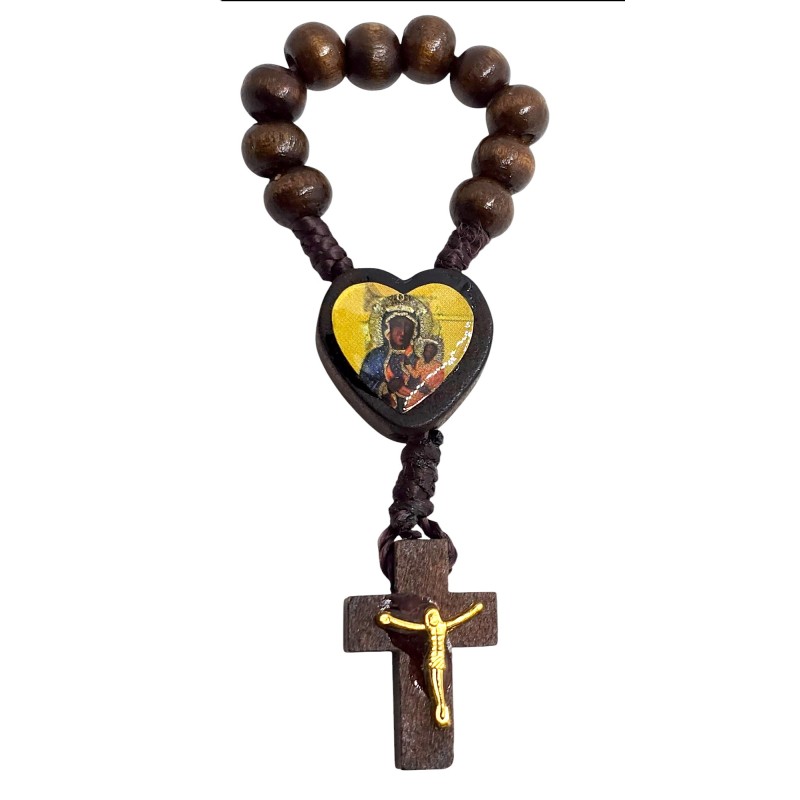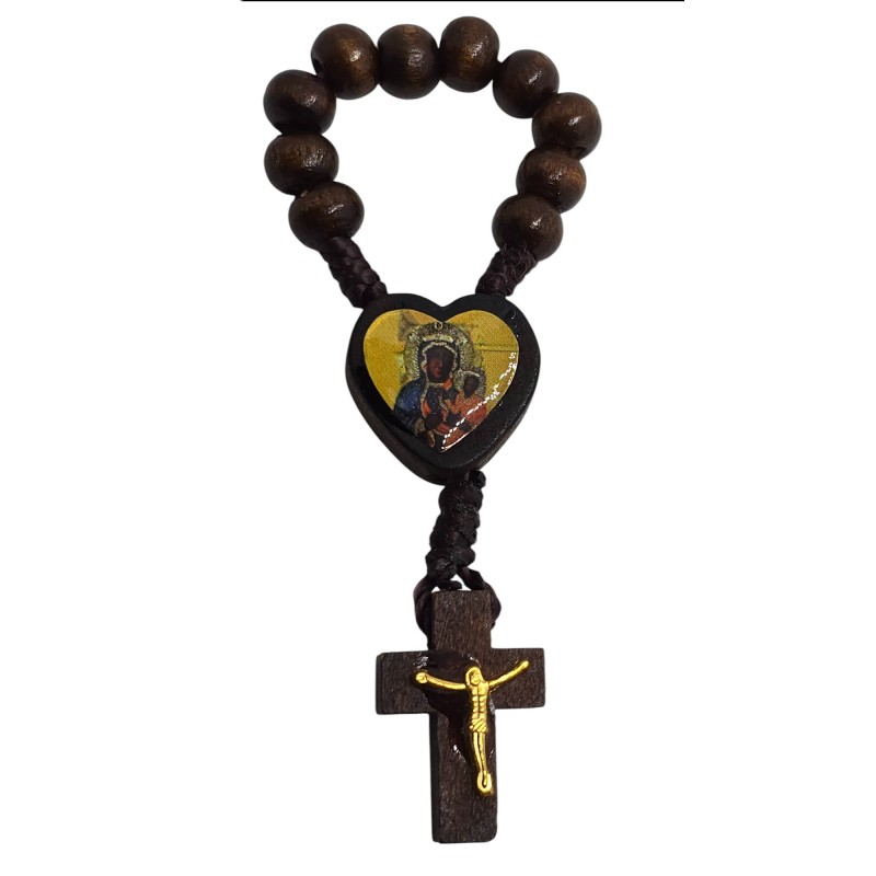 Urocza i niezwykle praktyczna, malutka dziesiątka różańca wykonana z naturalnego drewna. Jej niewielki rozmiar sprawia, że idealnie mieści się w dłoni, a nawet może być trzymana na palcu podczas modlitwy. Łącznikiem tej wyjątkowej dziesiątki jest małe, drewniane serce z wizerunkiem Matki Boskiej Częstochowskiej. Różaniec zakończony jest delikatnym, drewnianym krzyżykiem o wymiarach 14 x 22 mm, na którym umieszczona jest doklejana pasyjka w kolorze złotym, dodająca mu subtelnego blasku. Koraliki różańca mają wielkość 8 mm. Ta kompaktowa dziesiątka różańca to idealny towarzysz codziennej modlitwy, zawsze pod ręką.