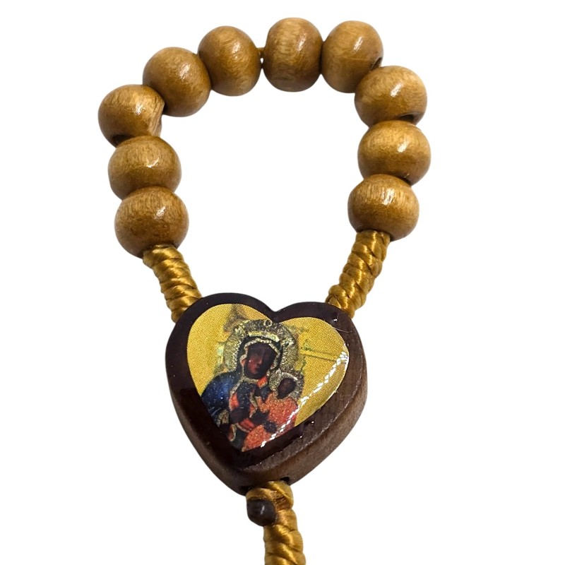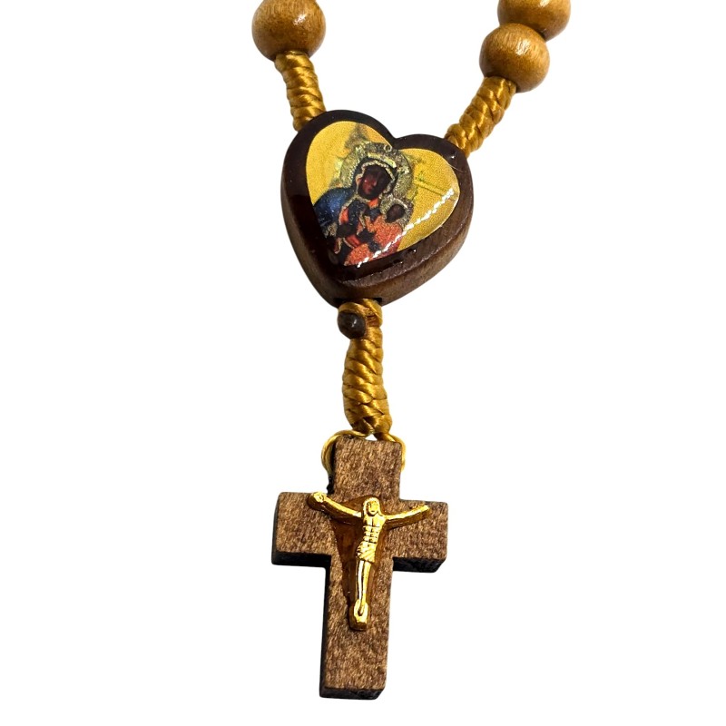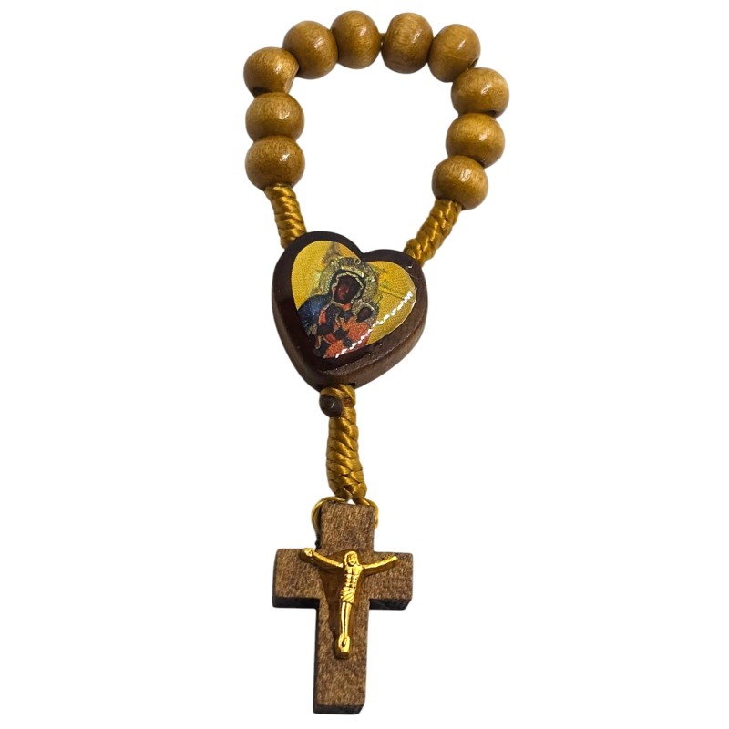 Urocza i niezwykle praktyczna, malutka dziesiątka różańca wykonana z naturalnego drewna. Jej niewielki rozmiar sprawia, że idealnie mieści się w dłoni, a nawet może być trzymana na palcu podczas modlitwy. Łącznikiem tej wyjątkowej dziesiątki jest małe, drewniane serce z wizerunkiem Matki Boskiej Częstochowskiej. Różaniec zakończony jest delikatnym, drewnianym krzyżykiem o wymiarach 14 x 22 mm, na którym umieszczona jest doklejana pasyjka w kolorze złotym, dodająca mu subtelnego blasku. Koraliki różańca mają wielkość 8 mm. Ta kompaktowa dziesiątka różańca to idealny towarzysz codziennej modlitwy, zawsze pod ręką.
