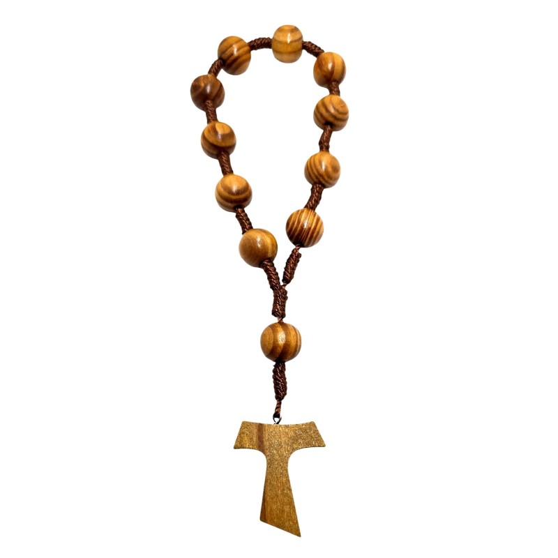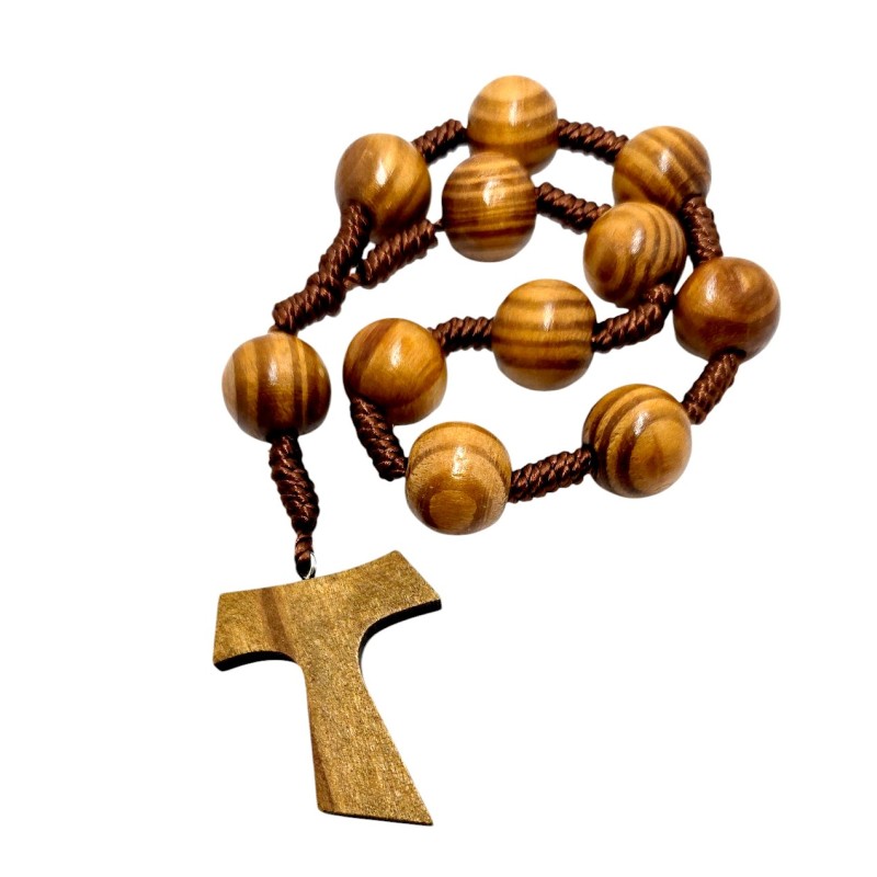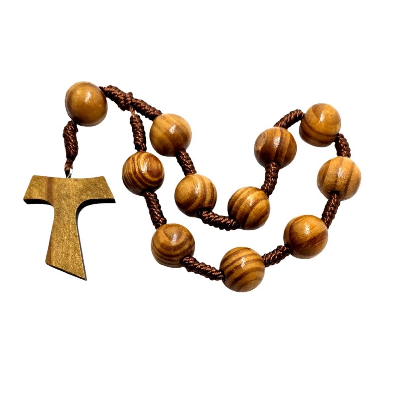 Solidna i wyrazista, duża dziesiątka różańca wykonana z naturalnego drewna oliwnego. Koraliki o imponującej wielkości 16 mm, nawleczone na trwałym sznurku, zapewniają komfort i skupienie podczas modlitwy. Różaniec zakończony jest charakterystyczną drewnianą Tauką o wymiarach 40 x 33 mm, symbolizującą oddanie franciszkańskie i znak zbawienia. Długość różańca wynosi 22 cm. Naturalne piękno drewna oliwnego i wyraźny znak Tau czynią tę dziesiątkę różańca wyjątkowym przedmiotem wiary i modlitwy.