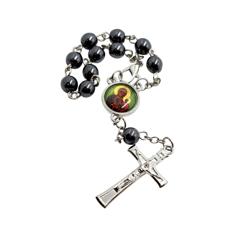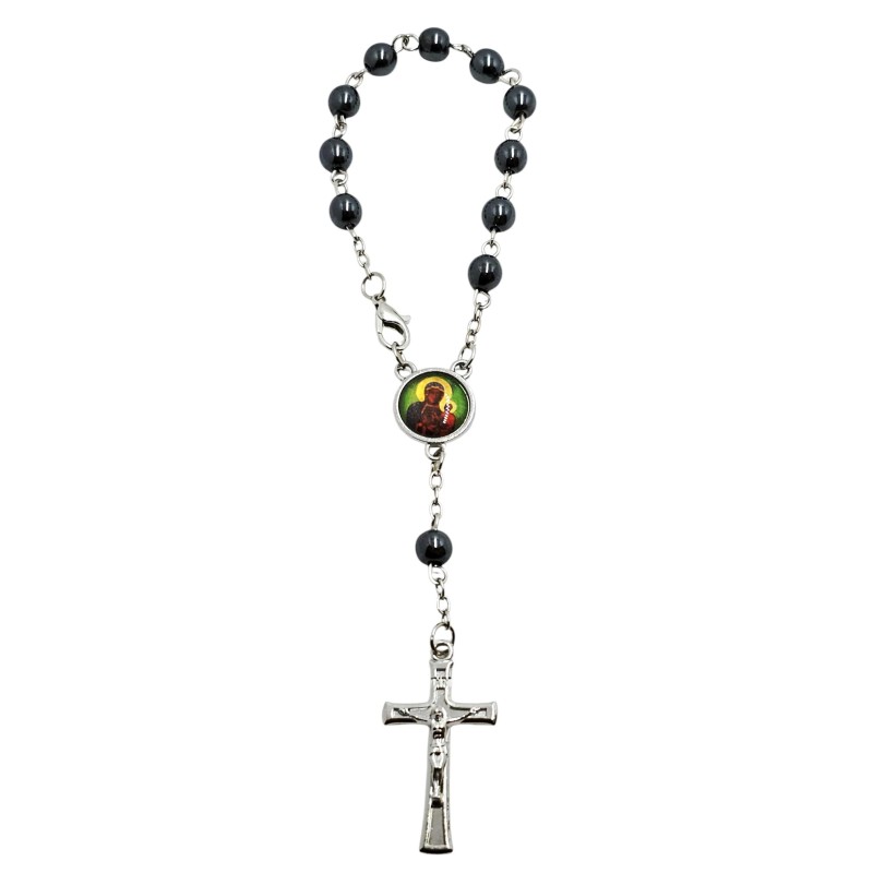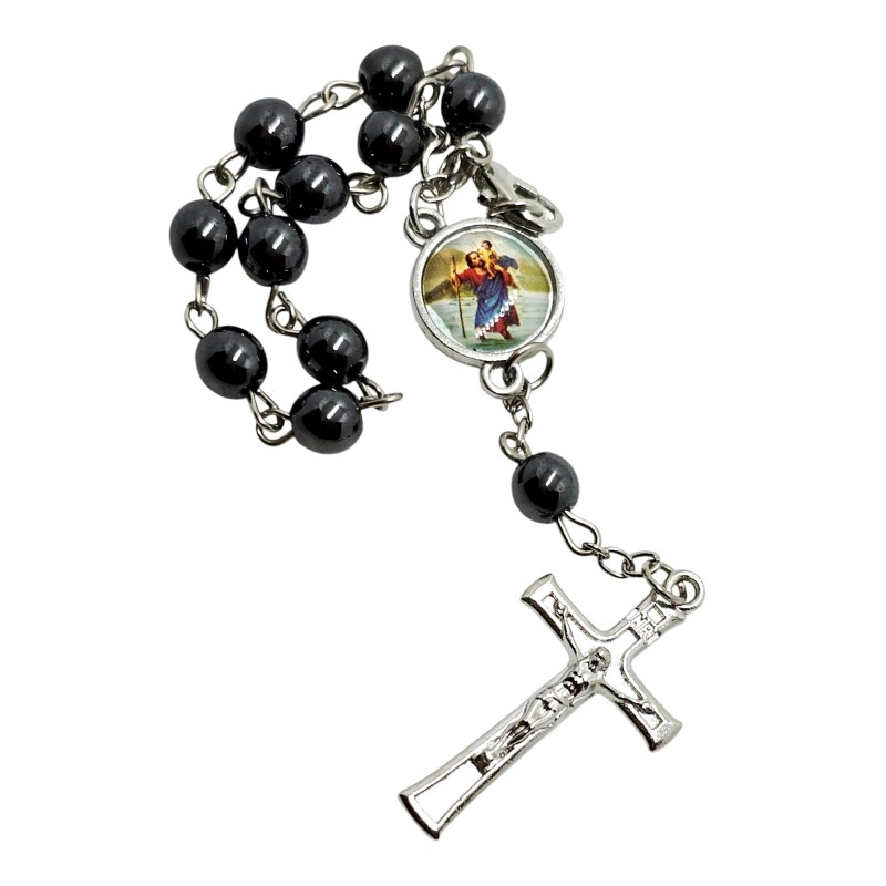 Zapinana Dziesiątka Różańca do Auta z Hematytu - Św. Krzysztof / Matka Boska Częstochowska, 6 mm