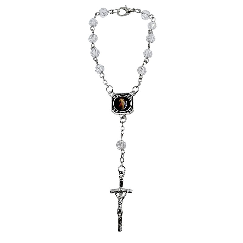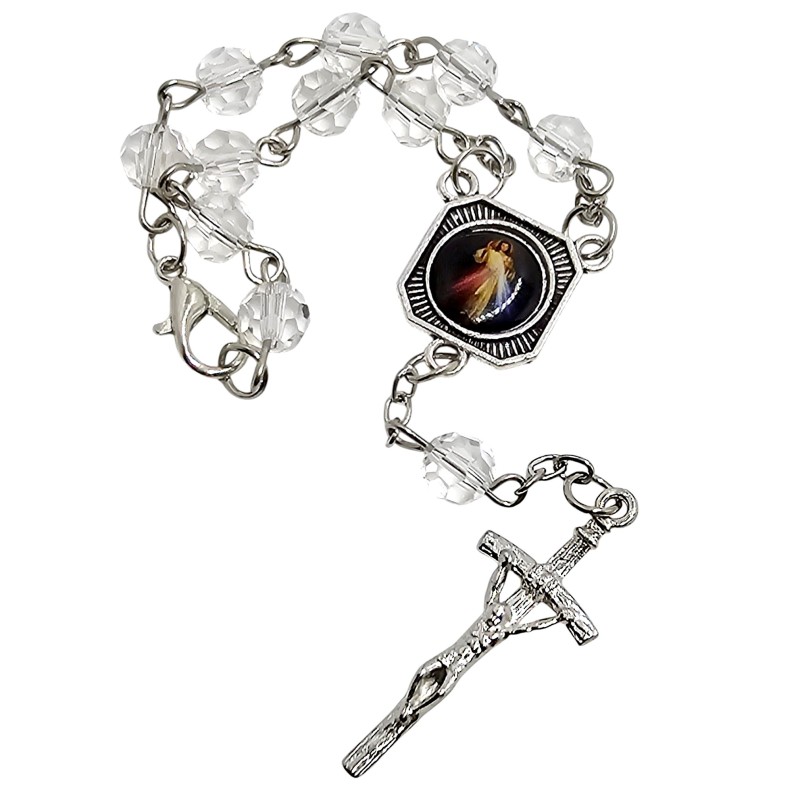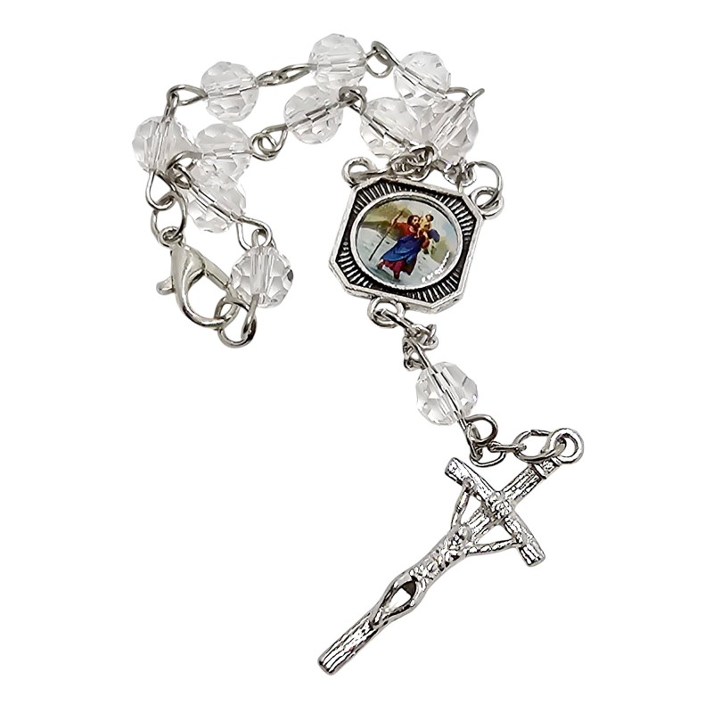 Praktyczna i stylowa zapinana dziesiątka różańca, idealna do umieszczenia w samochodzie. Wykonana z efektownych plastikowych koralików imitujących kryształki o średnicy 6 mm, wykonana na trwałym łańcuszku. Łącznikiem różańca jest dwustronny medalik przedstawiający z jednej strony Świętego Krzysztofa, patrona kierowców i podróżujących, a z drugiej Jezusa Miłosiernego. Całość wieńczy charakterystyczny krzyż papieski o wymiarach 13x32 mm. Dzięki kompaktowej długości 15 cm, różaniec nie zajmuje wiele miejsca i może towarzyszyć Ci w każdej podróży, przypominając o modlitwie i opiece świętych patronów.