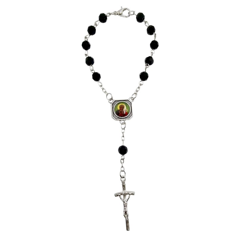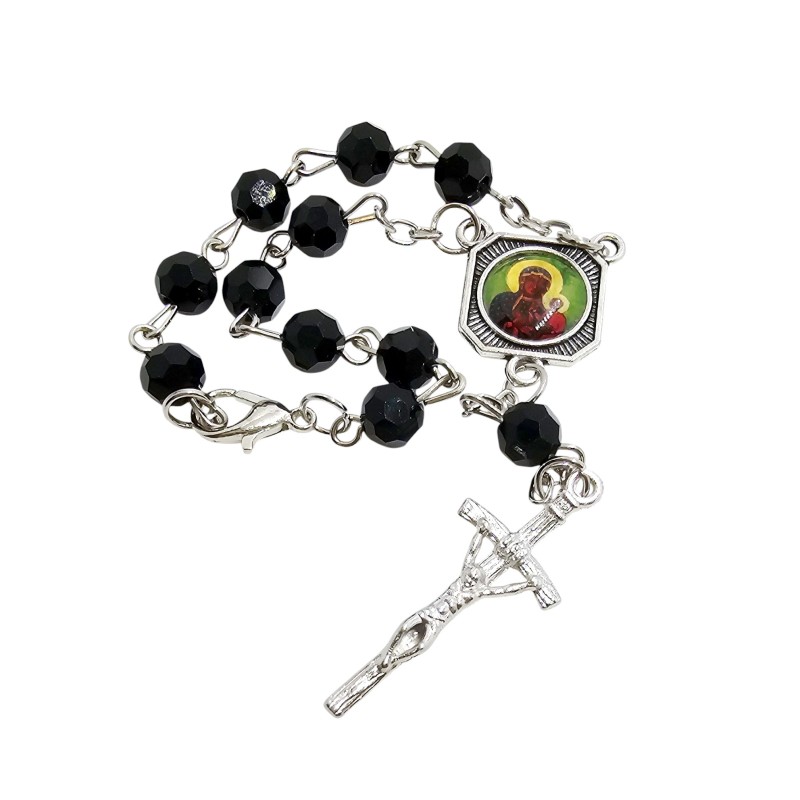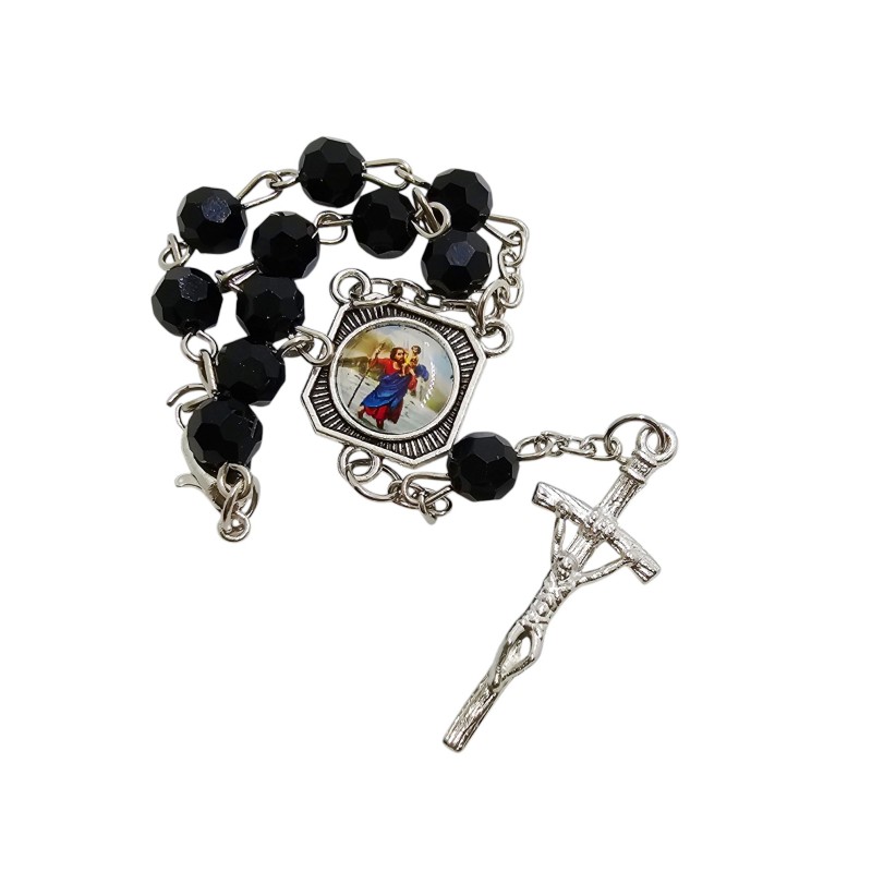 Praktyczna i stylowa zapinana dziesiątka różańca, idealna do umieszczenia w samochodzie. Wykonana z efektownych plastikowych koralików imitujących kryształki o średnicy 6 mm, nanizanych na trwałym łańcuszku. Łącznikiem różańca jest dwustronny medalik przedstawiający z jednej strony Świętego Krzysztofa, patrona kierowców i podróżujących, a z drugiej ukochaną Matkę Boską Częstochowską, Patronkę Polski. Całość wieńczy charakterystyczny krzyż papieski o wymiarach 13x32 mm. Dzięki kompaktowej długości 15 cm, różaniec nie zajmuje wiele miejsca i może towarzyszyć Ci w każdej podróży, przypominając o modlitwie i opiece świętych patronów.