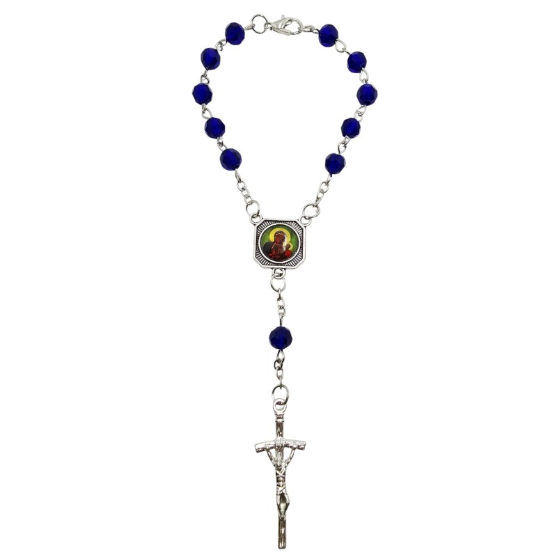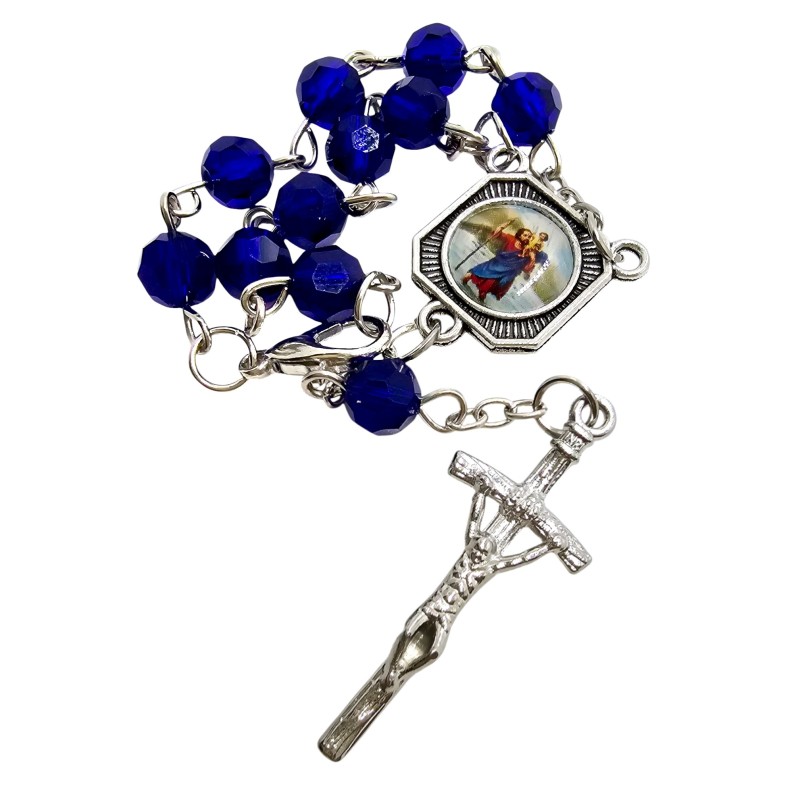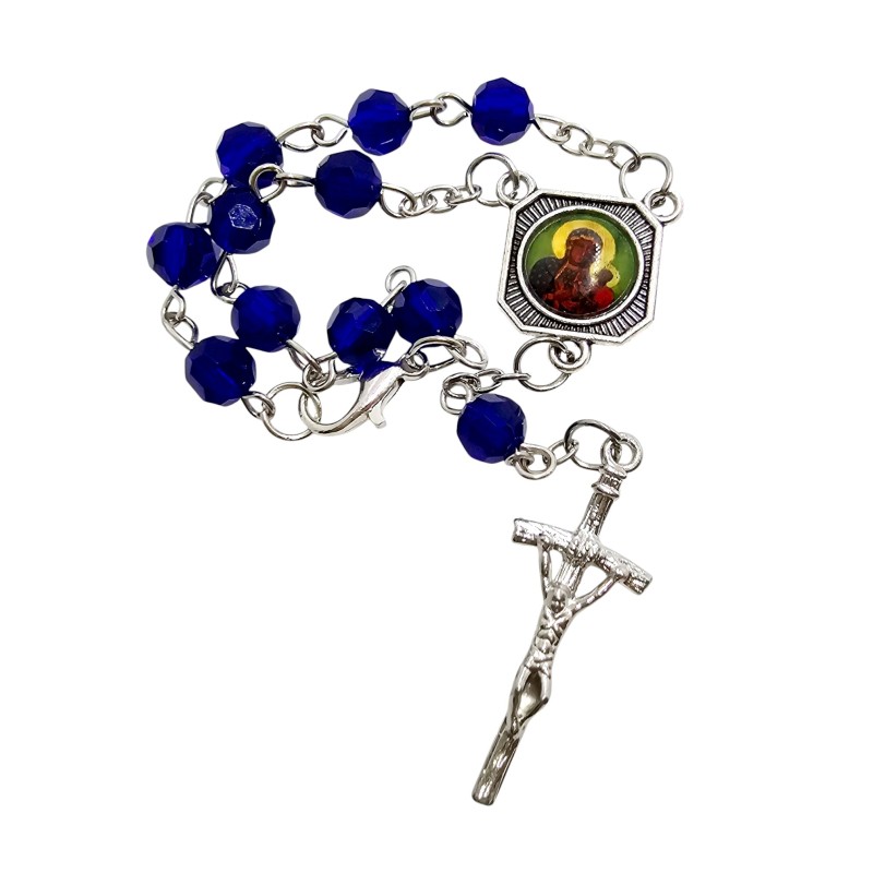 Praktyczna i stylowa zapinana dziesiątka różańca, idealna do umieszczenia w samochodzie. Wykonana z efektownych plastikowych koralików imitujących kryształki o średnicy 6 mm, nanizanych na trwałym łańcuszku. Łącznikiem różańca jest dwustronny medalik przedstawiający z jednej strony Świętego Krzysztofa, patrona kierowców i podróżujących, a z drugiej ukochaną Matkę Boską Częstochowską, Patronkę Polski. Całość wieńczy charakterystyczny krzyż papieski o wymiarach 13x32 mm. Dzięki kompaktowej długości 15 cm, różaniec nie zajmuje wiele miejsca i może towarzyszyć Ci w każdej podróży, przypominając o modlitwie i opiece świętych patronów.