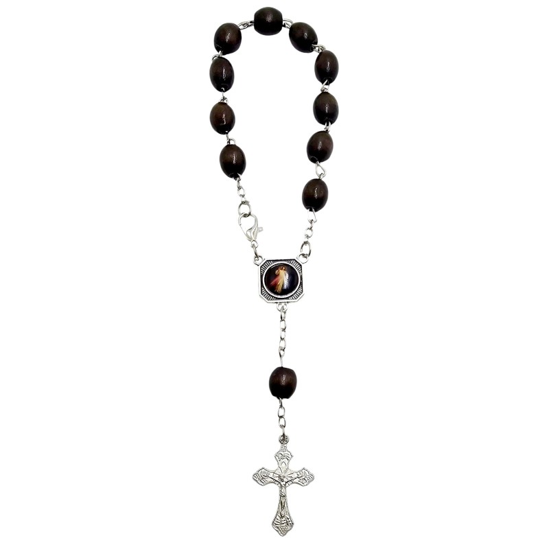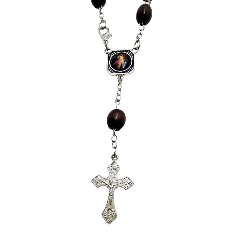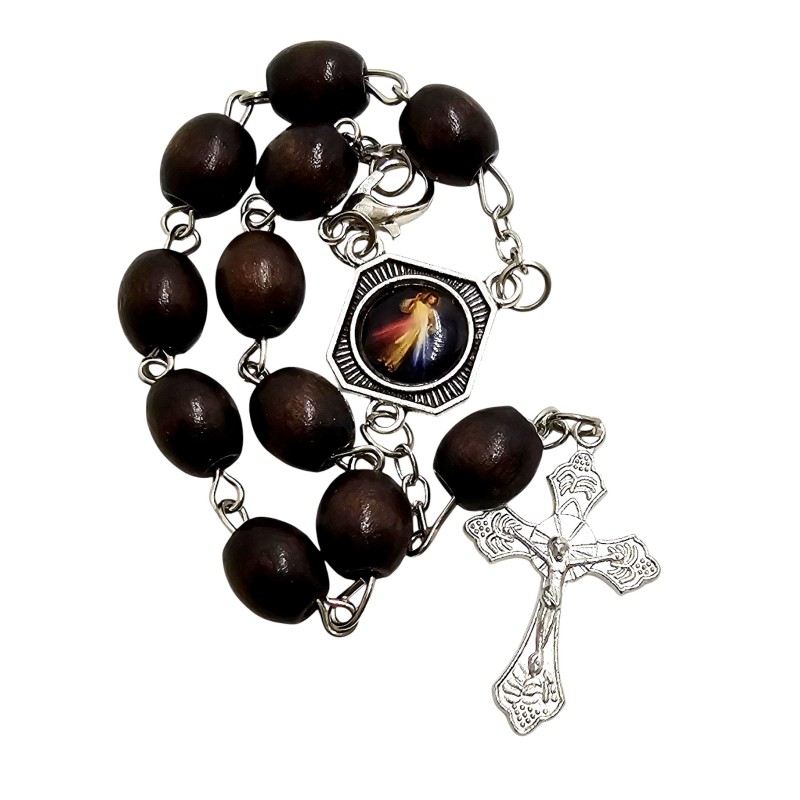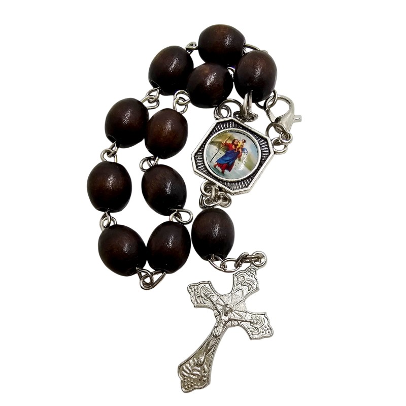 Praktyczna i pełna duchowego znaczenia zapinana dziesiątka różańca. Wykonana z naturalnych, drewnianych koralików o średnicy 8 mm na trwałym łańcuszku. Łącznikiem dziesiątki jest dwustronny medalik przedstawiający z jednej strony Jezusa Miłosiernego, a z drugiej patrona podróżujących - Świętego Krzysztofa. Całość wieńczy ozdobny krzyż o wymiarach 28x18 mm. Dzięki zapięciu dziesiątkę można zawiesić w aucie. To piękny i osobisty sposób na codzienną modlitwę.