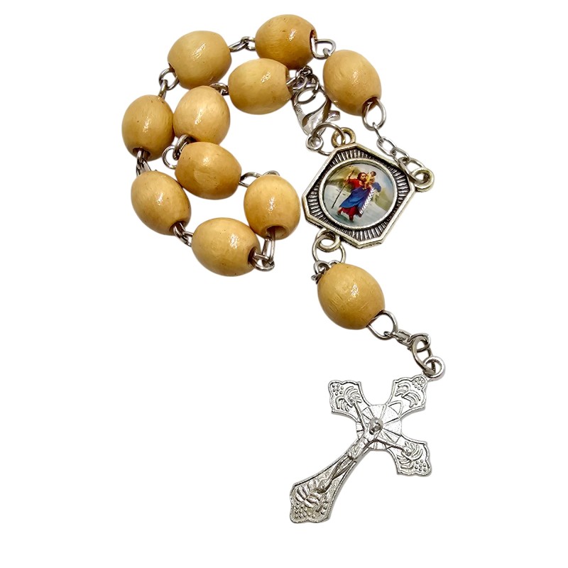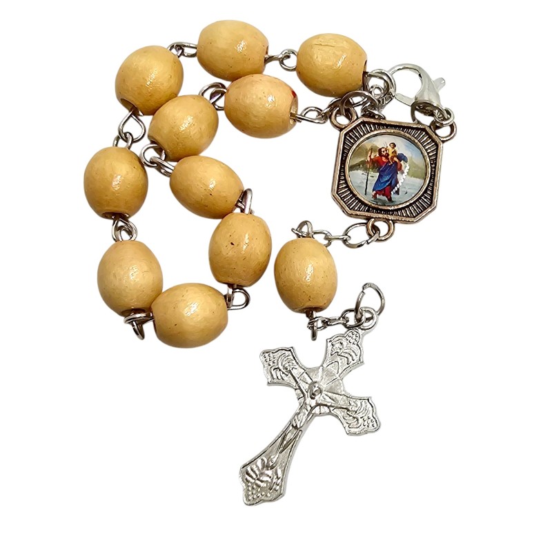 Praktyczna i pełna duchowego znaczenia zapinana dziesiątka różańca. Wykonana z naturalnych, drewnianych koralików o średnicy 8 mm na trwałym łańcuszku. Łącznikiem dziesiątki jest dwustronny medalik przedstawiający z jednej strony Matkę Boską Częstochowską, a z drugiej patrona podróżujących - Świętego Krzysztofa. Całość wieńczy ozdobny krzyż o wymiarach 28x18 mm. Dzięki zapięciu dziesiątkę można zawiesić w aucie. To piękny i osobisty sposób na codzienną modlitwę.