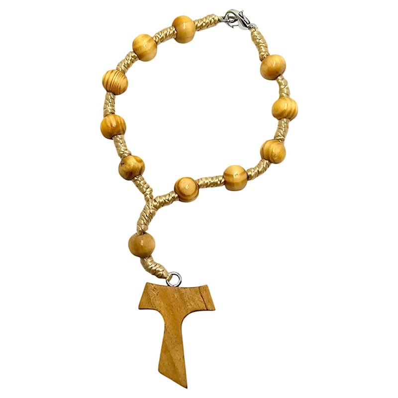 Centralnym punktem tej dziesiątki jest solidna Tauka o wymiarach 27x22 mm. Krzyż Tau to starożytny symbol, często kojarzony ze św. Franciszkiem z Asyżu, oznaczający pokorę, prostotę i otwarte ramiona Chrystusa. Jego minimalistyczny, a zarazem mocny kształt doskonale komponuje się z naturalnym charakterem drewna.