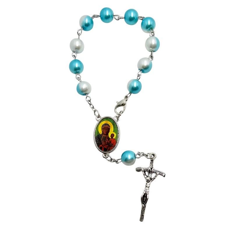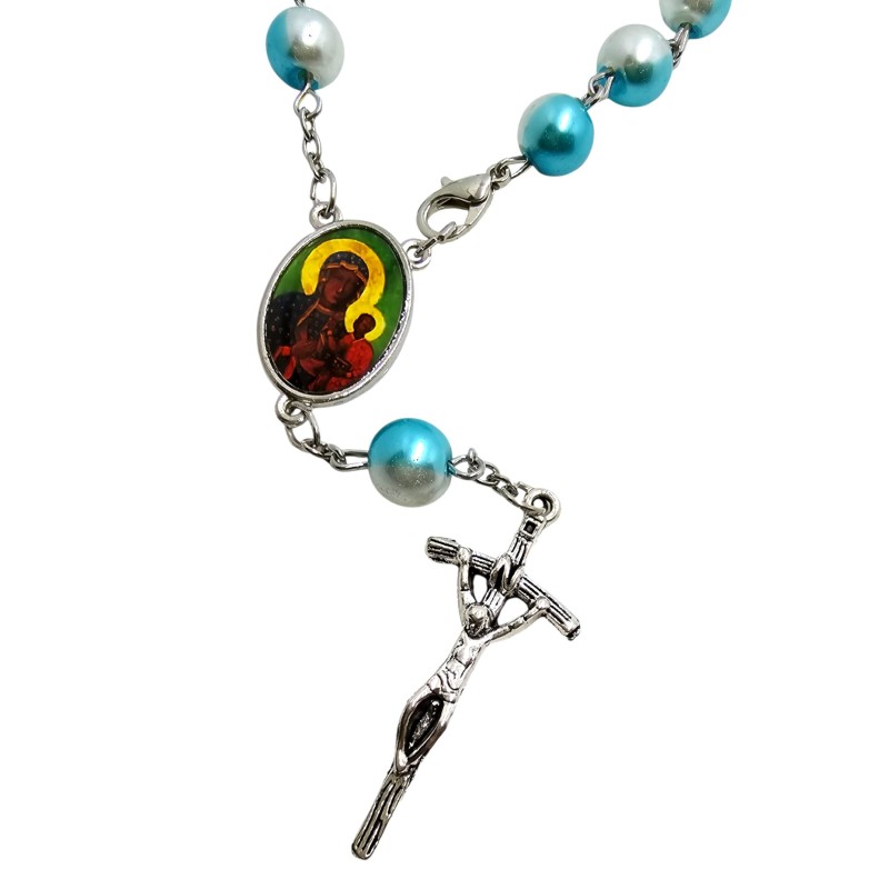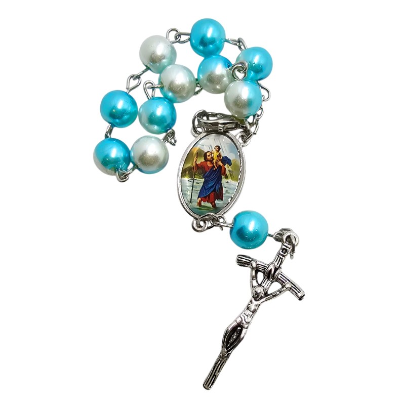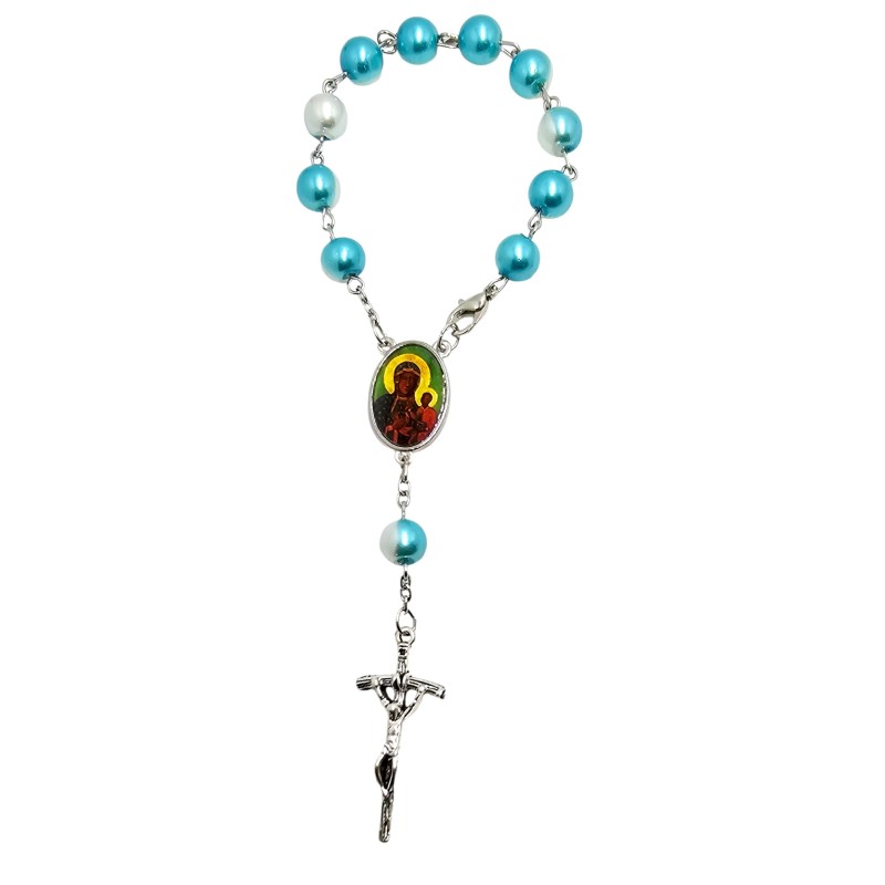 Zapinana Dziesiątka Różańca Biało-Niebieska z Perłowym połyskiem - Matka Boska Częstochowska / Św. Krzysztof , Krzyż Papieski.