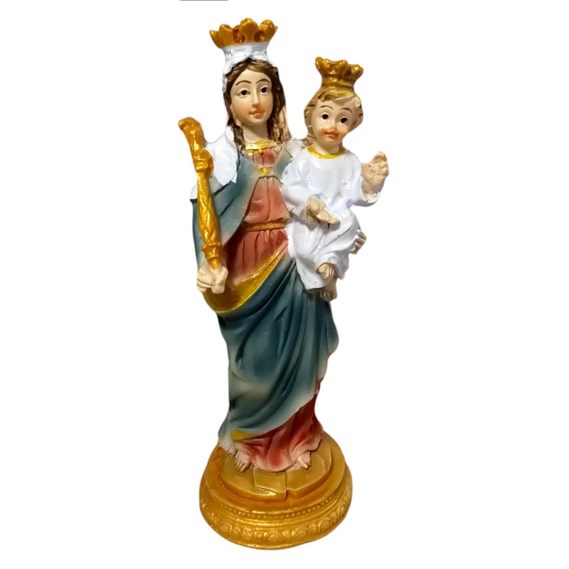 Figurka ma około 10 cm wysokości i 4 cm szerokości, co czyni ją idealnym, dyskretnym akcentem na półce, szafce nocnej czy komodzie. Wykonana z trwałej żywicy syntetycznej, została starannie pokolorowana z dbałością o każdy detal.