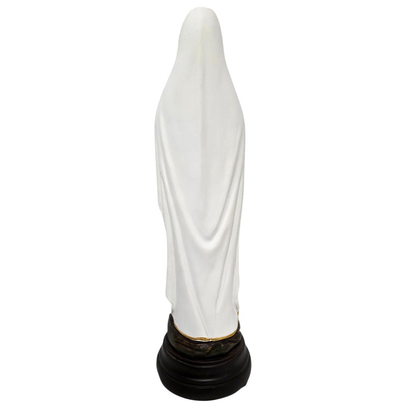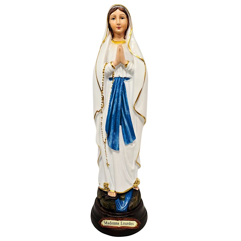 Pełna wdzięku i pokoju figurka przedstawiająca Maryję z Lourdes, wykonana z trwałej żywicy syntetycznej. Mierząca 30 cm wysokości, ukazuje Matkę Bożą w Jej charakterystycznym wizerunku z objawień w Lourdes. Maryja odziana jest w nieskazitelnie białą szatę, przepasaną błękitnym pasem, symbolizującym Jej czystość i niebiański charakter. Jej ręce złożone są w pobożnym geście modlitwy, a na ręce spoczywa różaniec, przypominający o Jej wezwaniu do modlitwy różańcowej. Jej łagodne spojrzenie emanuje miłością i współczuciem. Ta starannie wykonana figurka będzie pięknym wyrazem wiary i przypomnieniem o cudownych objawieniach w Lourdes.