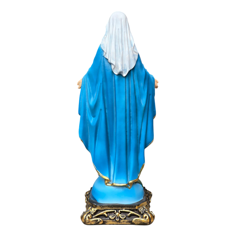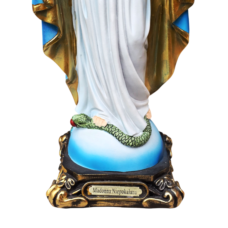 Otocz swój dom duchową opieką z elegancką figurką Matki Bożej Niepokalanej. Ta 20-centymetrowa statuetka, wykonana z trwałej żywicy syntetycznej, przedstawia Maryję stojącą na kuli ziemskiej, zwyciężającą grzech pierworodny poprzez zmiażdżenie węża trzymającego jabłko. Jej biała suknia i niebieski płaszcz symbolizują czystość i boskość, a spokojna twarz emanuje łagodnością i miłością. Idealna do domowego ołtarzyka, jako inspirujący element dekoracji lub wartościowy prezent dla bliskich.