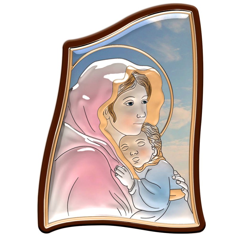 Srebrny Kolorowany Obrazek Matka Boża z Dzieciątkiem na Drewnie - 10x7,5 cm, Z Podstawką.