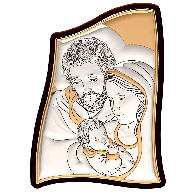 Użycie złotych akcentów, które pięknie współgrają ze srebrnym tłem, nadaje obrazkowi głębi i ciepła, podkreślając delikatność i świętość wizerunku Maryi, Józefa i Dzieciątka Jezus. Srebrny wizerunek jest umieszczony na solidnej, drewnianej podstawie, co dodaje mu naturalnego uroku i stabilności. Do obrazka dołączona jest również praktyczna podstawka, dzięki której jest on od razu gotowy do postawienia.