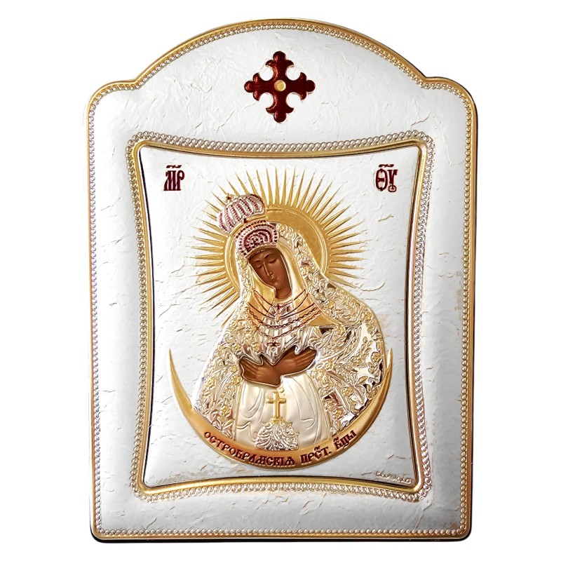 Obrazek Matki Bożej Ostrobramskiej, uznawanej za cudowną i patronkę wielu miast, jest starannie wykonany, oddając wierność detali oryginału. Srebrna powierzchnia jest subtelnie zdobiona, co dodaje mu głębi i podkreśla majestat wizerunku. To niewielki, ale bardzo wyrazisty element, który doskonale wpasuje się w każdą przestrzeń.