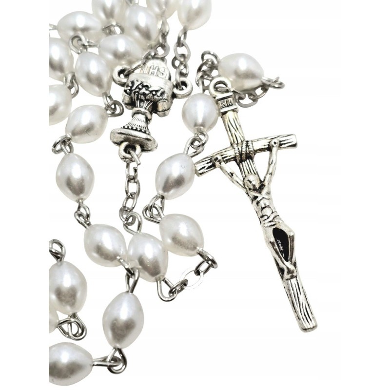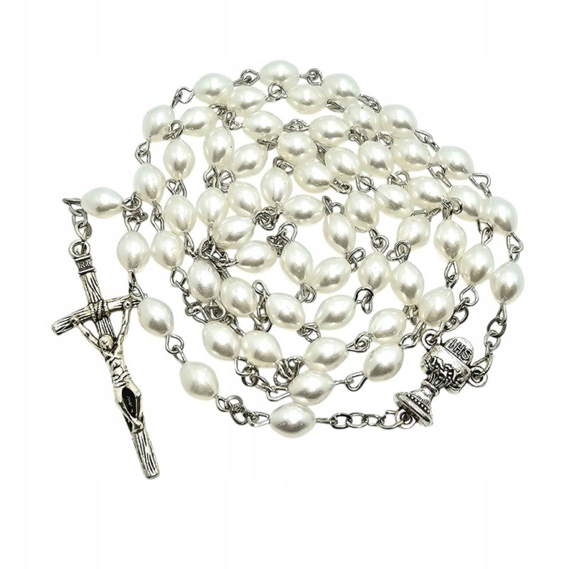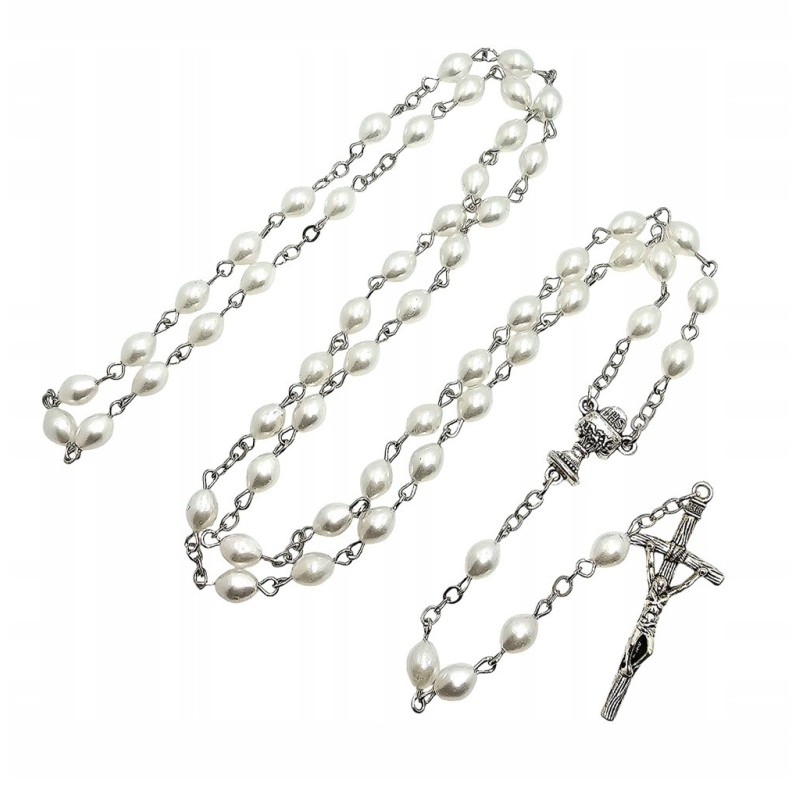 Wyjątkowy różaniec komunijny, idealna pamiątka Pierwszej Komunii Świętej. Owalne koraliki imitujące perły dodają elegancji, a łącznik w kształcie kielicha symbolizuje Eucharystię. Różaniec zwieńczony jest papieskim krzyżem, podkreślającym jego uroczysty charakter. Wykonany z wysokiej jakości materiałów, trwały i piękny. Doskonały jako pamiątka tego wyjątkowego dnia.