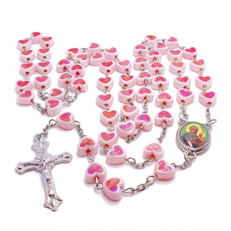 Odkryj piękno modlitwy z tym uroczym, różowym różańcem, wykonanym z koralików w kształcie serca. Centralnym elementem różańca jest łącznik z wizerunkiem Matki Boskiej Częstochowskiej, dodający mu wyjątkowego, polskiego charakteru. Całość dopełnia subtelny, metalowy krzyż. Ten różaniec to nie tylko narzędzie modlitwy, ale także piękny przedmiot, który może towarzyszyć Ci w codziennym życiu, przypominając o duchowych wartościach. Idealny na prezent dla bliskiej osoby.