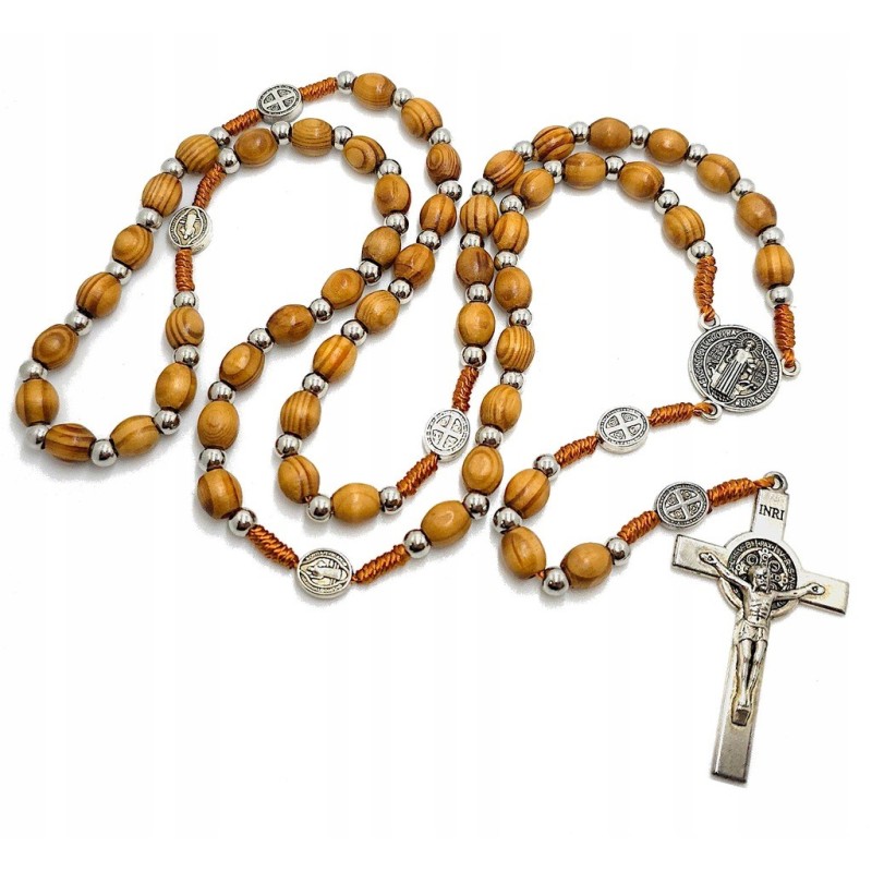 Odkryj głębię modlitwy z tym wyjątkowym, ręcznie wykonanym drewnianym różańcem. Każdy koralik, wykonany z naturalnego drewna, został starannie wykonany i oddzielony srebrną, plastikową kuleczką, co dodaje mu elegancji i trwałości. Różaniec zwieńczony jest metalowym Krzyżem św. Benedykta, a dziesiątki rozdzielone są medalikami z wizerunkiem tego świętego, symbolizującymi ochronę przed złem. To nie tylko narzędzie modlitwy, ale także piękny, duchowy przedmiot, idealny dla osób poszukujących różańca o szczególnym znaczeniu.