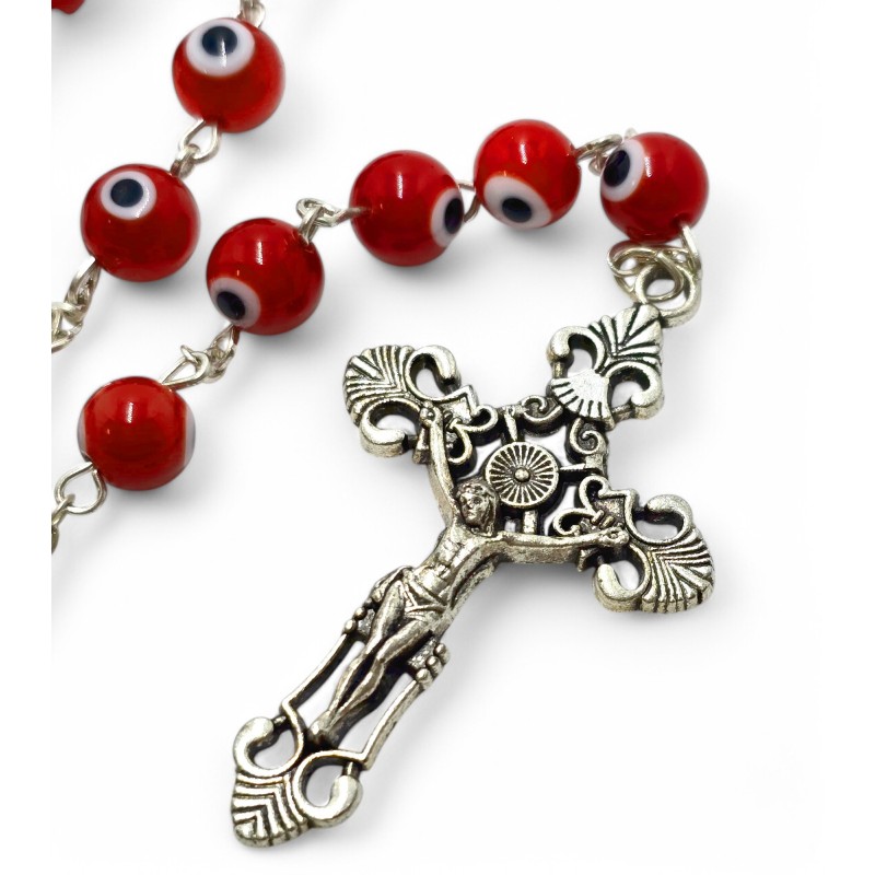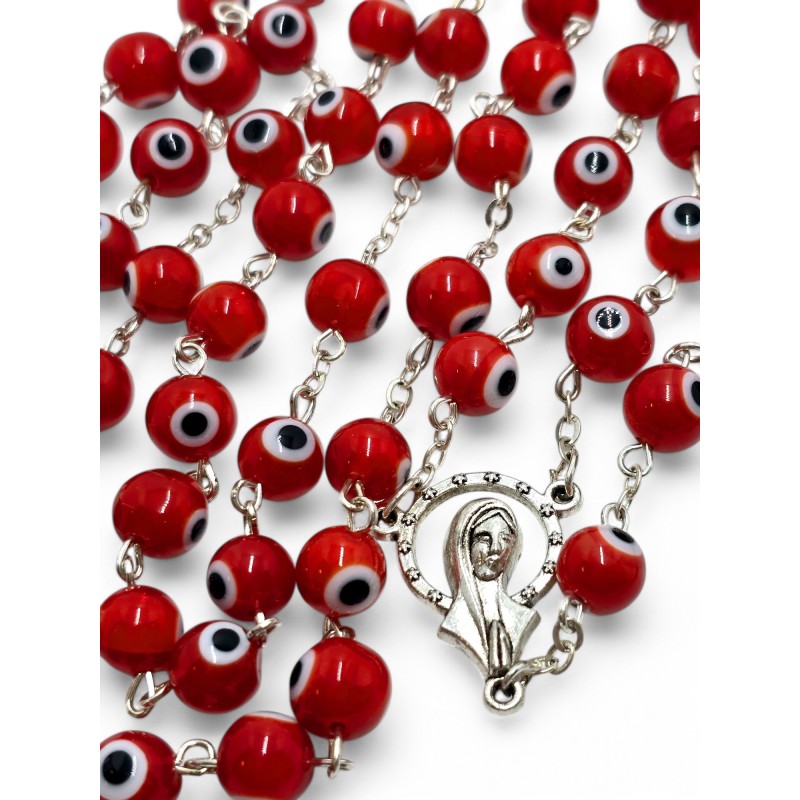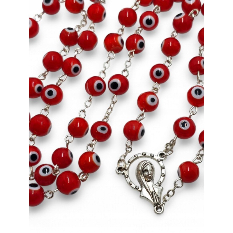 Odkryj niezwykłe piękno tego szklanego różańca, który przyciąga wzrok swoim oryginalnym designem. Czerwone, szklane koraliki, ozdobione małymi czarno-białymi oczkami, tworzą unikalny i efektowny wzór. Piękny łącznik z wizerunkiem Matki Boskiej oraz ażurowy krzyż wykonany z metalu dodają różańcowi elegancji i duchowego charakteru.