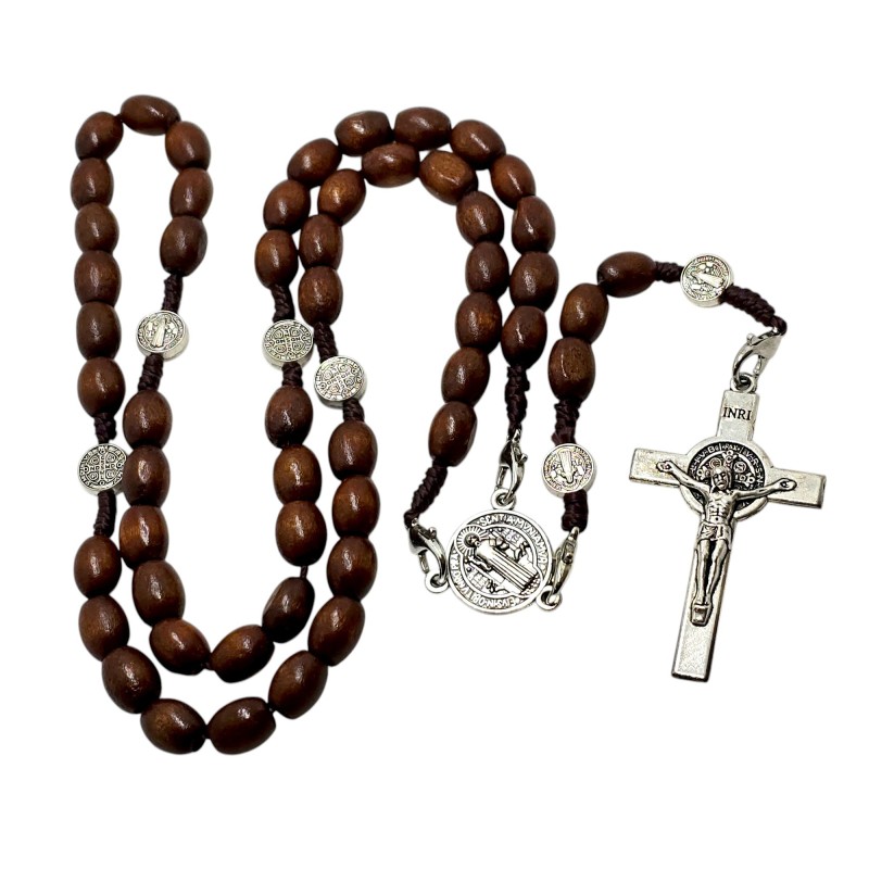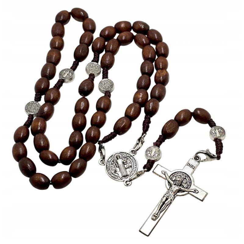 Odkryj moc ochronną i prostotę modlitwy z naszym drewnianym różańcem św. Benedykta. Brązowe, owalne koraliki o wielkości 10 mm, oddzielone medalikami św. Benedykta, prowadzą przez kolejne dziesiątki, a całość wieńczy krzyż św. Benedykta. Wykonany z naturalnego drewna, ten 50-centymetrowy różaniec jest nie tylko pięknym przedmiotem kultu, ale także potężnym narzędziem w walce ze złem. Wyróżnia się tym, że można z łatwością go zawiesić, ma aż cztery klamerki. Idealny do codziennej modlitwy i jako wyjątkowy prezent.