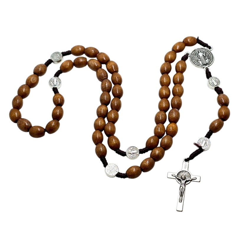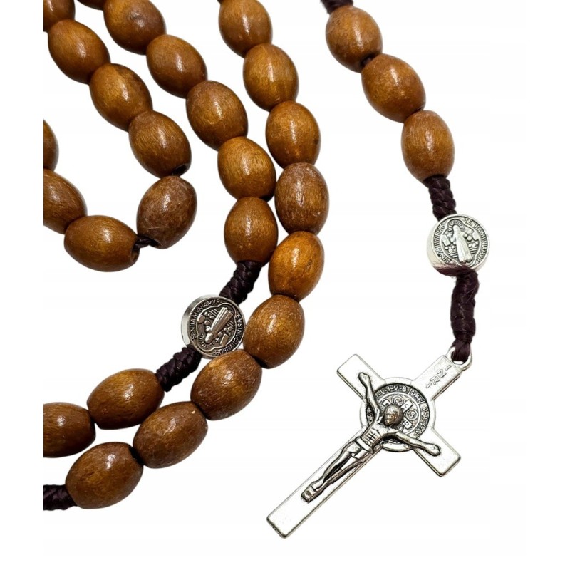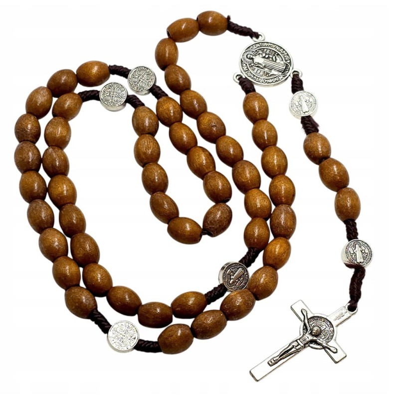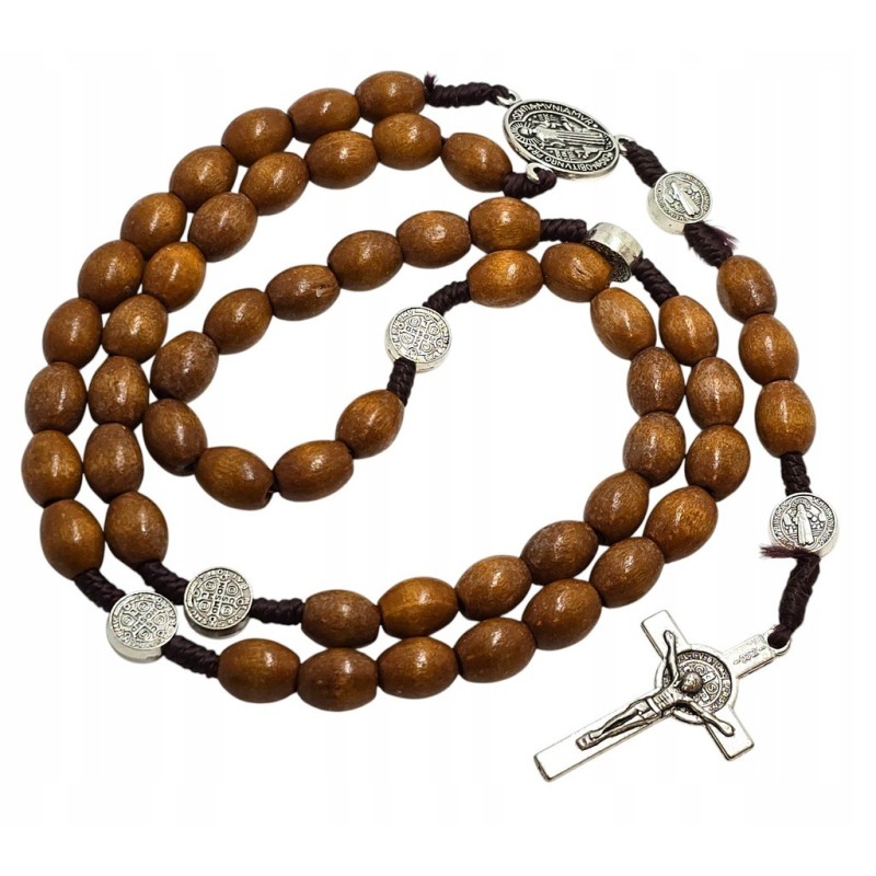 Odkryj moc ochronną i prostotę modlitwy z naszym drewnianym różańcem św. Benedykta. Jasnobrązowe, owalne koraliki o wielkości 10 mm, oddzielone medalikami św. Benedykta, prowadzą przez kolejne dziesiątki, a całość wieńczy metalowy krzyż św. Benedykta. Wykonany z naturalnego drewna jest nie tylko pięknym przedmiotem kultu, ale także potężnym narzędziem w walce ze złem. Idealny do codziennej modlitwy i jako wyjątkowy prezent.