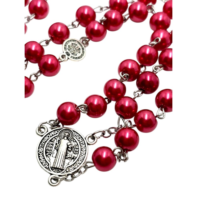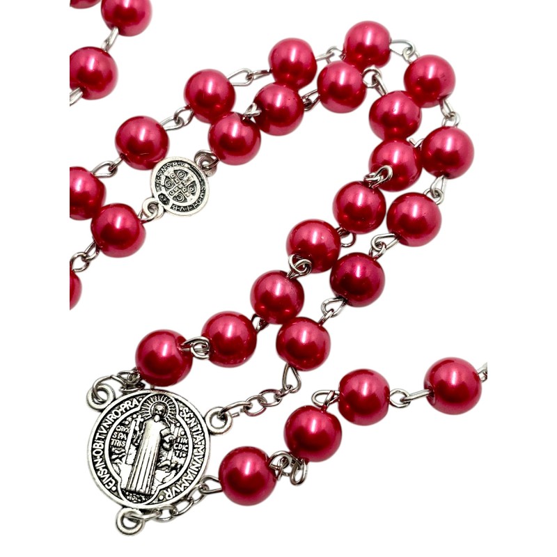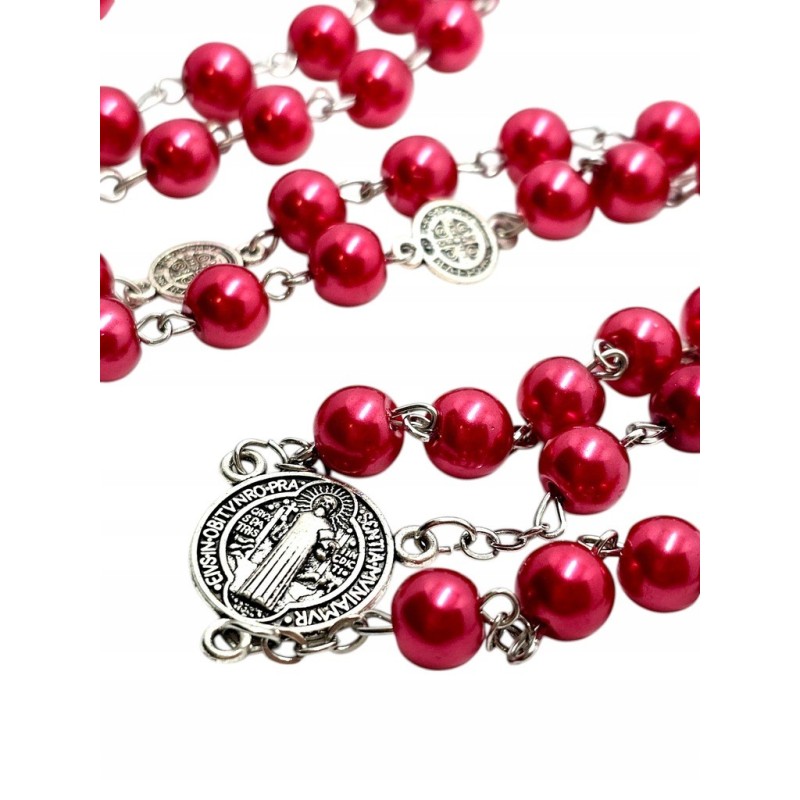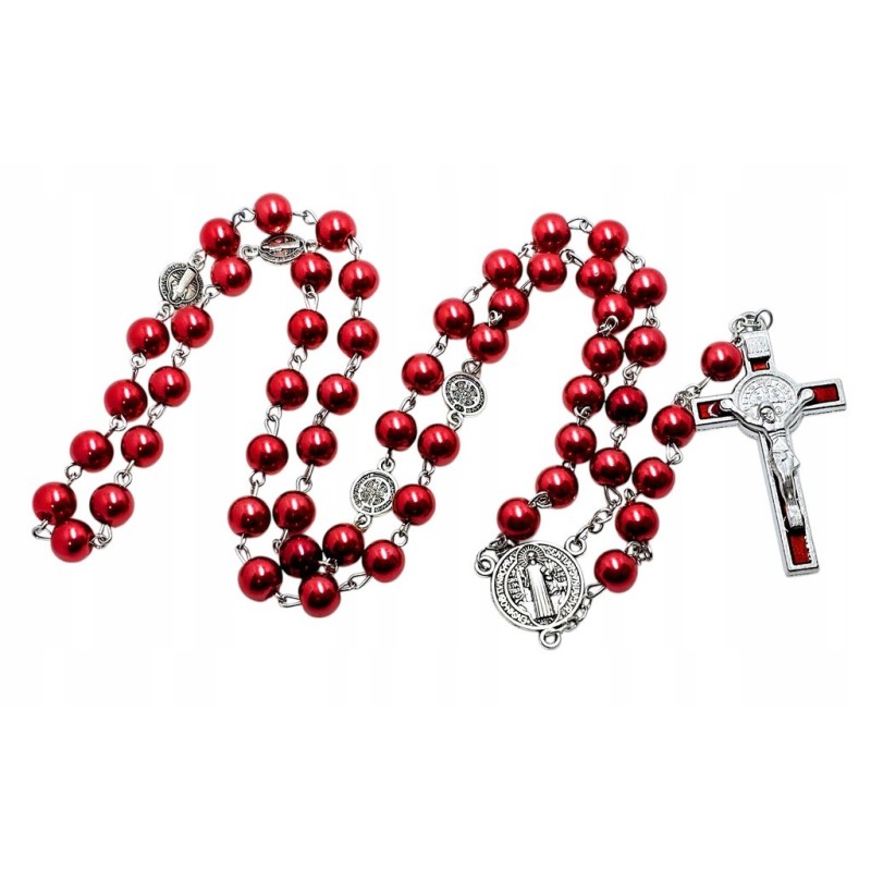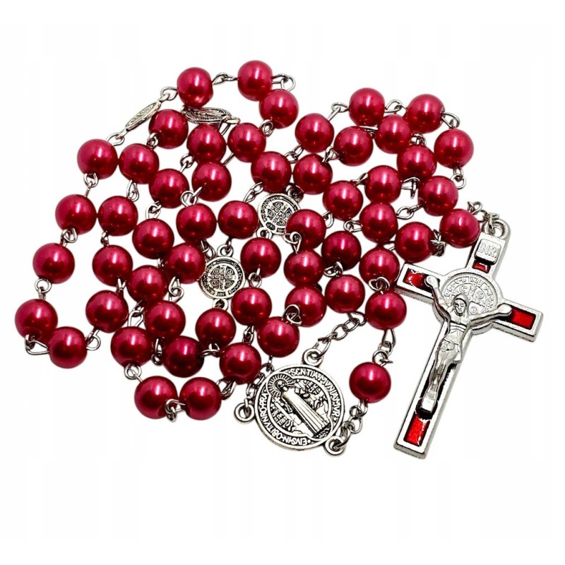 Odkryj piękno modlitwy i moc ochronną z naszym czerwono-perłowym różańcem. Wykonany z eleganckich, szklanych koralików o perłowym połysku w odcieniach czerwieni, ten różaniec emanuje subtelną elegancją. Dziesiątki różańca oddzielone są metalowymi medalikami św. Benedykta, potężnym symbolem ochrony przed złem. Całość wieńczy wyrazisty krzyż św. Benedykta w kolorze czerwonym. Ten 53-centymetrowy różaniec jest idealny do codziennej modlitwy i jako wyjątkowy prezent o głębokim znaczeniu.