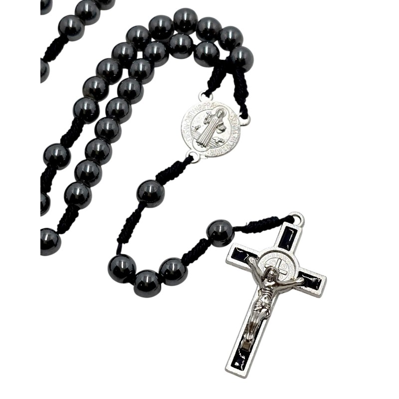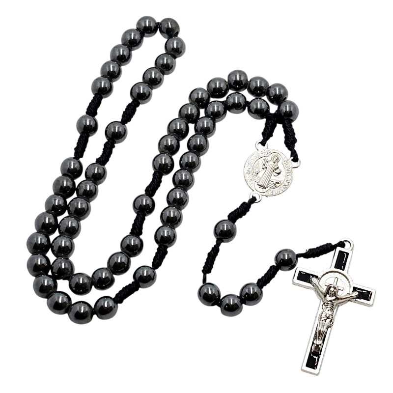 Odkryj moc ochronną i prostotę modlitwy z różańcem św. Benedykta wykonanym z hematytu. Grafitowe, okrągłe koraliki o wielkości 6 mm, a całość wieńczy metalowy krzyż św. Benedykta. Różaniec wykonany z hematytu jest nie tylko pięknym przedmiotem kultu, ale także potężnym narzędziem modlitwy. Idealny do codziennej modlitwy i jako wyjątkowy prezent.