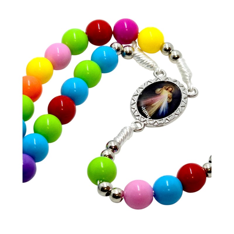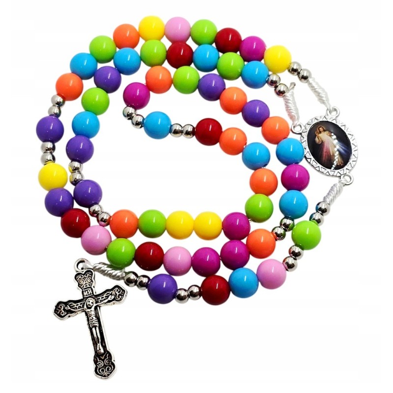 Zaproś swoje dziecko do modlitwy z tym radosnym, kolorowym różańcem dziecięcym. Wykonany z bezpiecznych, plastikowych koralików o wielkości 8 mm, nawleczonych na wytrzymały sznurek. Poszczególne dziesiątki różańca oddzielają małe, srebrne plastikowe koraliki, dodając mu subtelnego blasku. Centralnym elementem jest łącznik - medalik przedstawiający wizerunki Jezusa Miłosiernego ("Jezu Ufam Tobie") oraz Matki Bożej Ostrobramskiej. Całość wieńczy metalowy krzyżyk o wymiarach 20x33 mm. Ten kolorowy różaniec to wspaniały sposób na wprowadzenie najmłodszych w świat wiary i modlitwy.