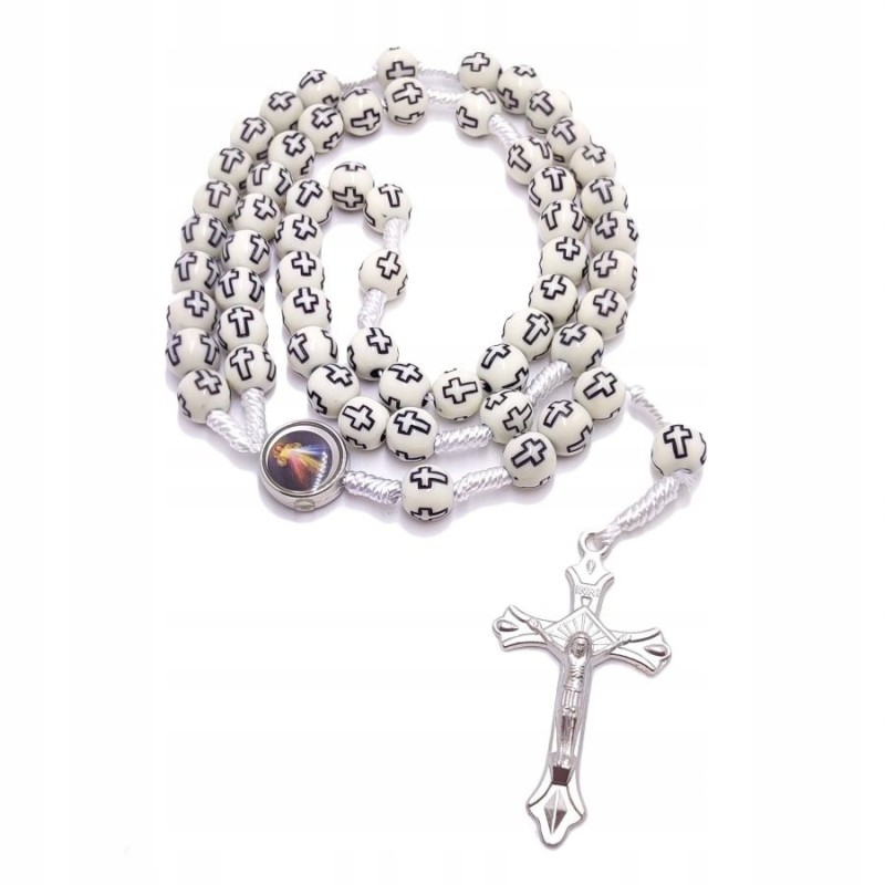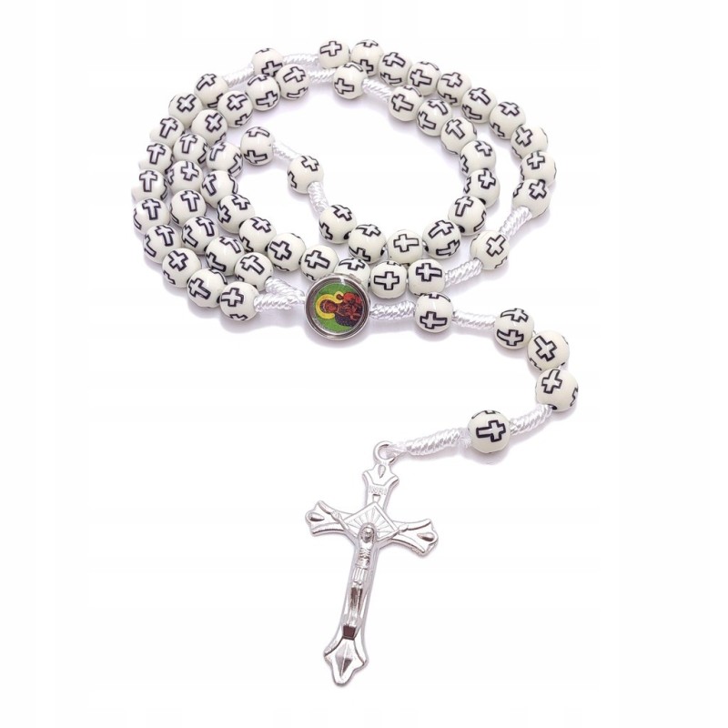 Biały Różaniec z Czarnymi Krzyżami - Jezu Ufam Tobie, Matka Boska Częstochowska.