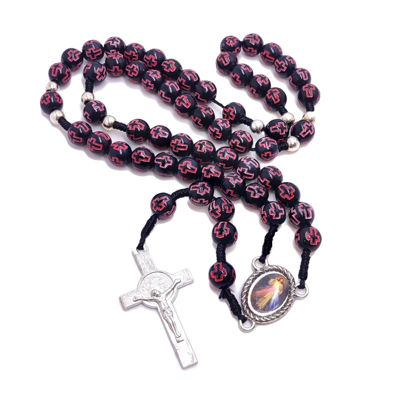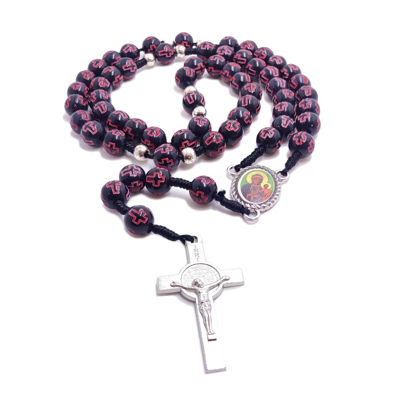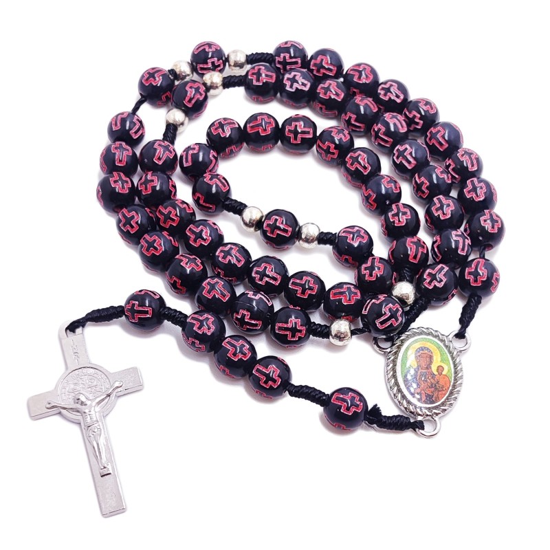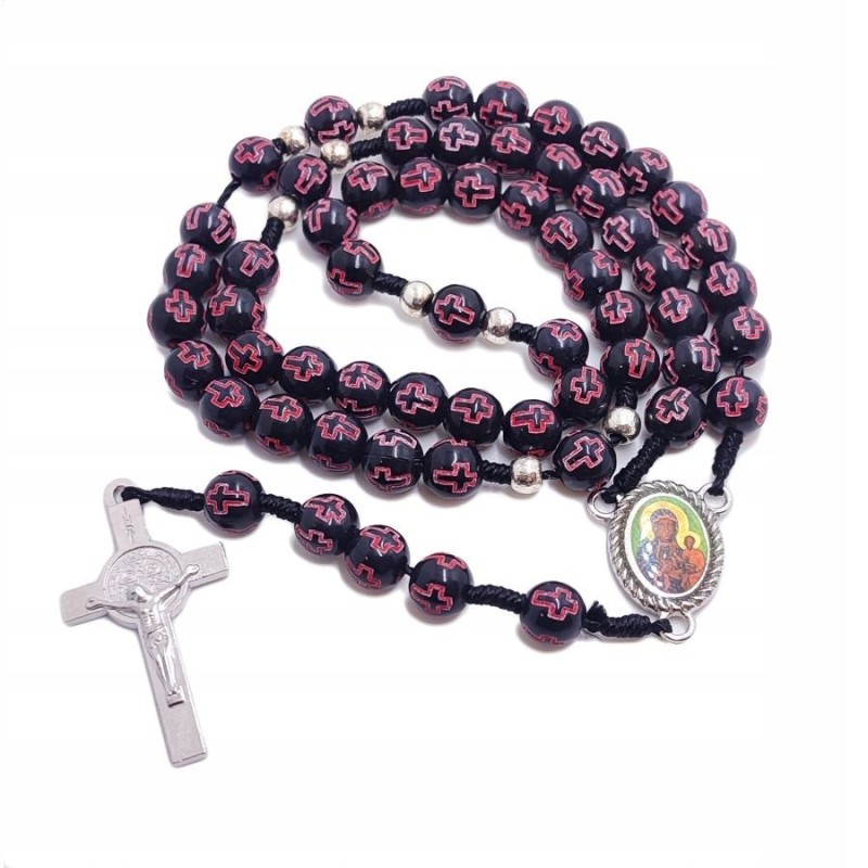 Czarny Różaniec z Czerwonymi Krzyżami - Jezu Ufam Tobie, Matka Boska Częstochowska.
