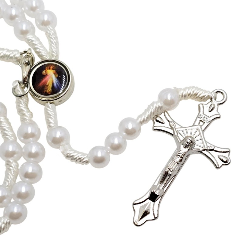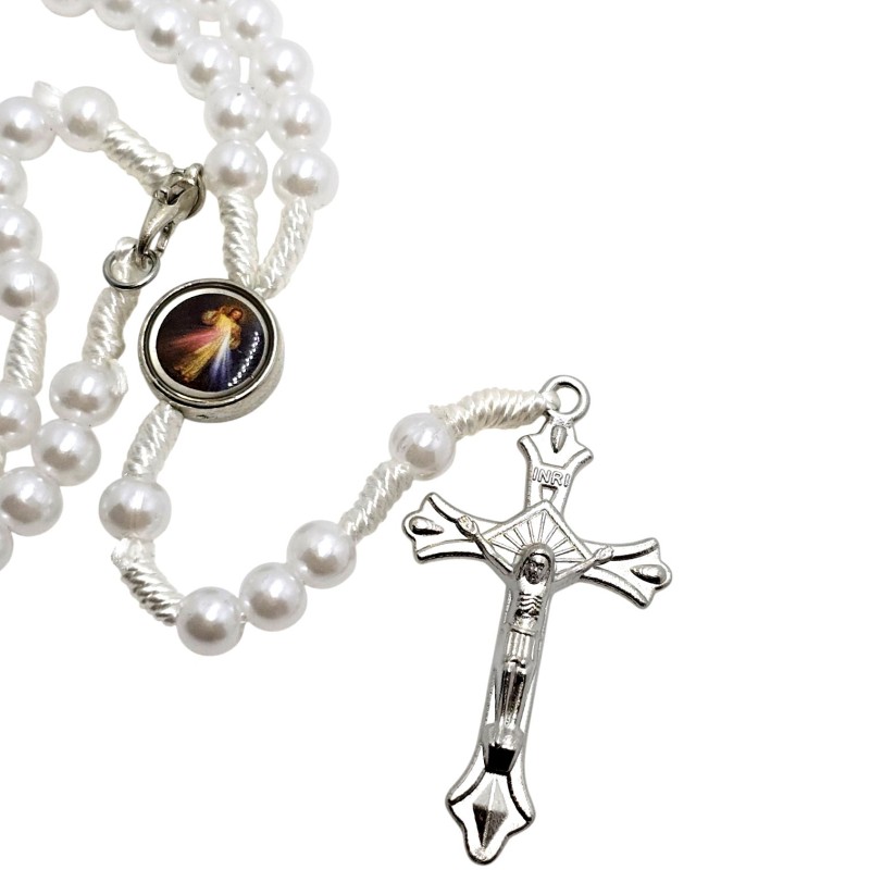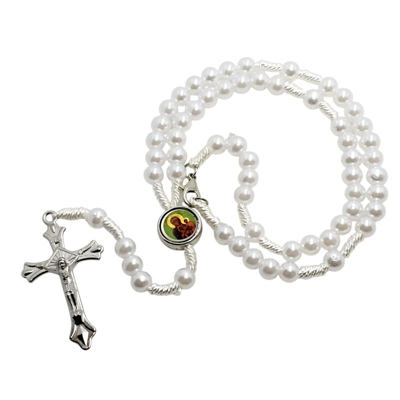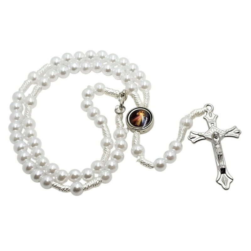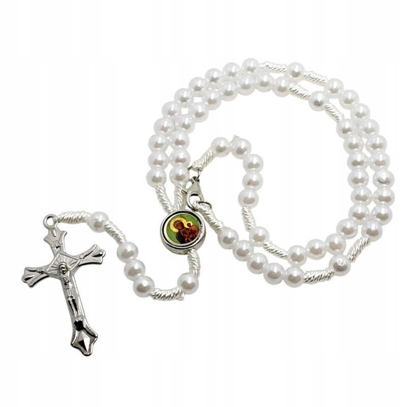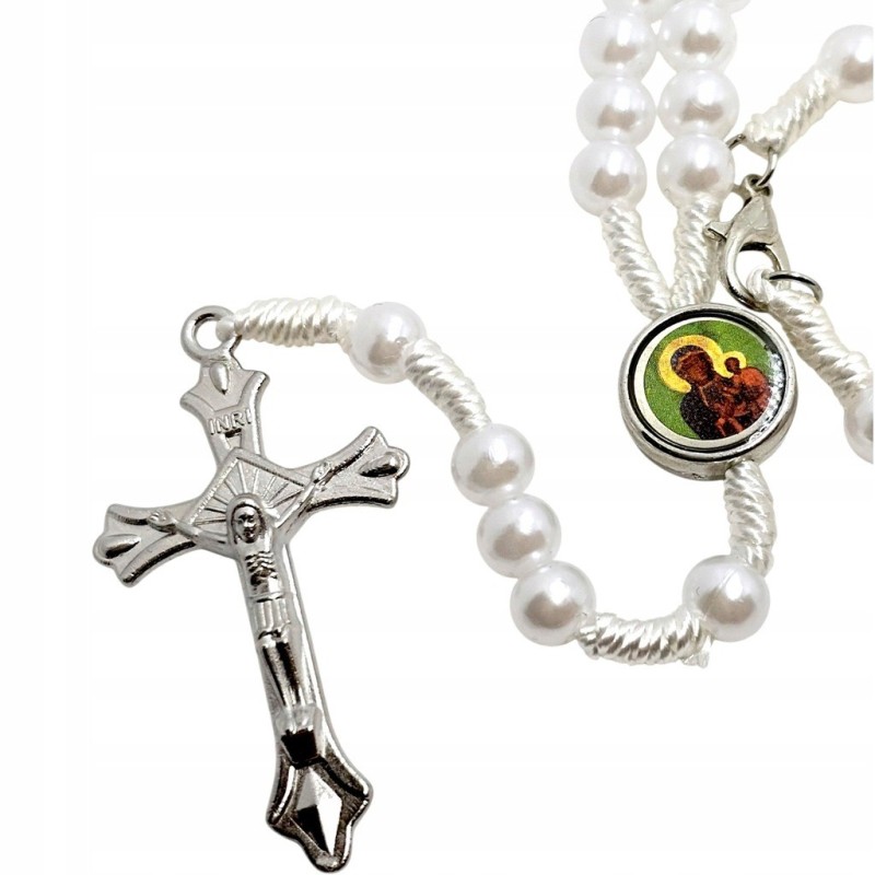 Odkryj piękno modlitwy i miej wizerunki świętych zawsze przy sobie dzięki temu wyjątkowemu, zapinanemu różańcowi perełkowemu. Wykonany z eleganckich, plastikowych koralików o perłowym połysku w rozmiarze 6 mm, nawleczonych na trwały sznurek. Centralnym elementem jest kolorowy łącznik przedstawiający Jezusa Miłosiernego ("Jezu Ufam Tobie") oraz Matkę Boską Częstochowską. Całość wieńczy bardzo ładny, metalowy krzyż o wymiarach 23x40 mm. Dzięki praktycznemu zapięciu i długości około 30 cm różaniec idealnie nadaje się do zawieszenia w samochodzie, przypominając o duchowych wartościach w podróży.