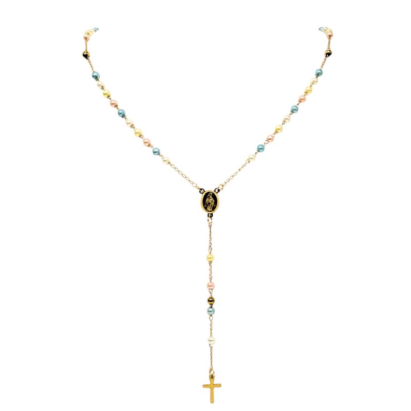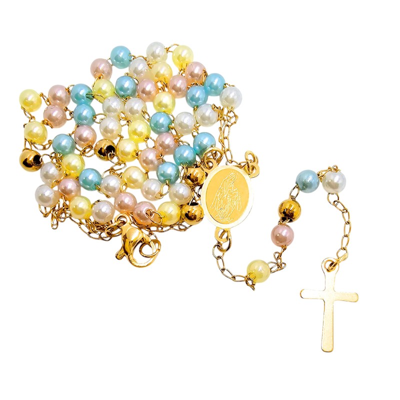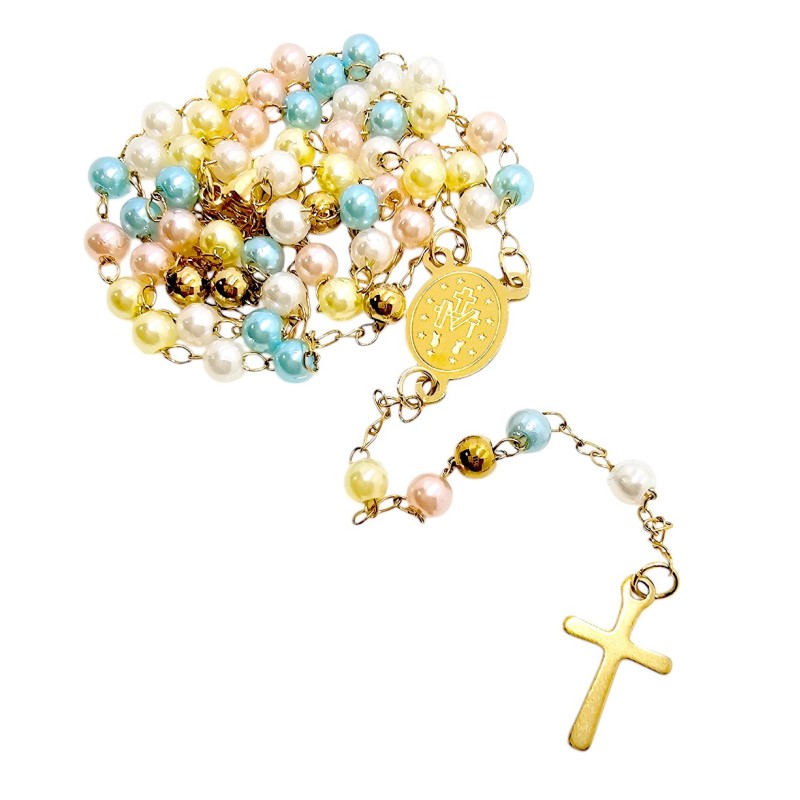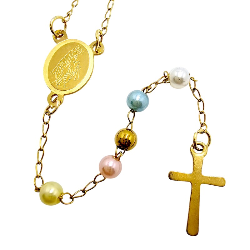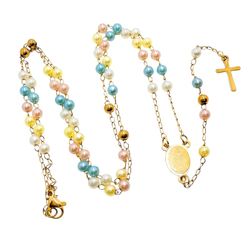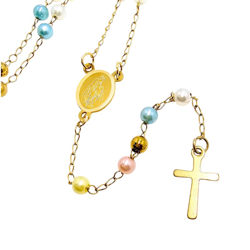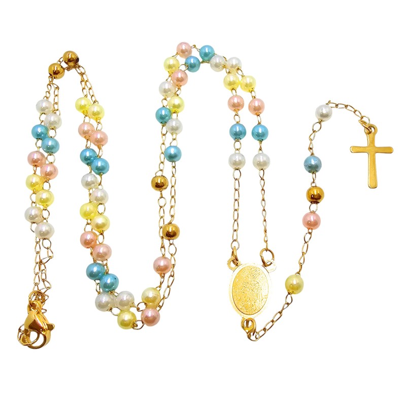 Jego największym atutem są kolorowe, subtelne, kuleczki o wielkości 4 mm, które posiadają perłowy połysk. Lśniące w świetle koraliki dodają naszyjnikowi lekkości i kobiecego uroku. Całość wieńczy niesłychanie prosty i delikatny krzyżyk o wielkości 15x10 mm, harmonijnie dopasowany do subtelnej formy różańca.